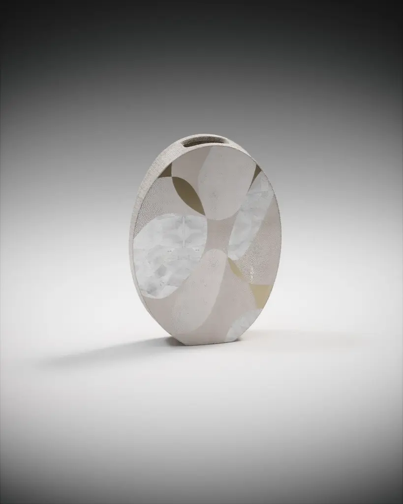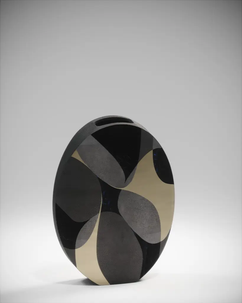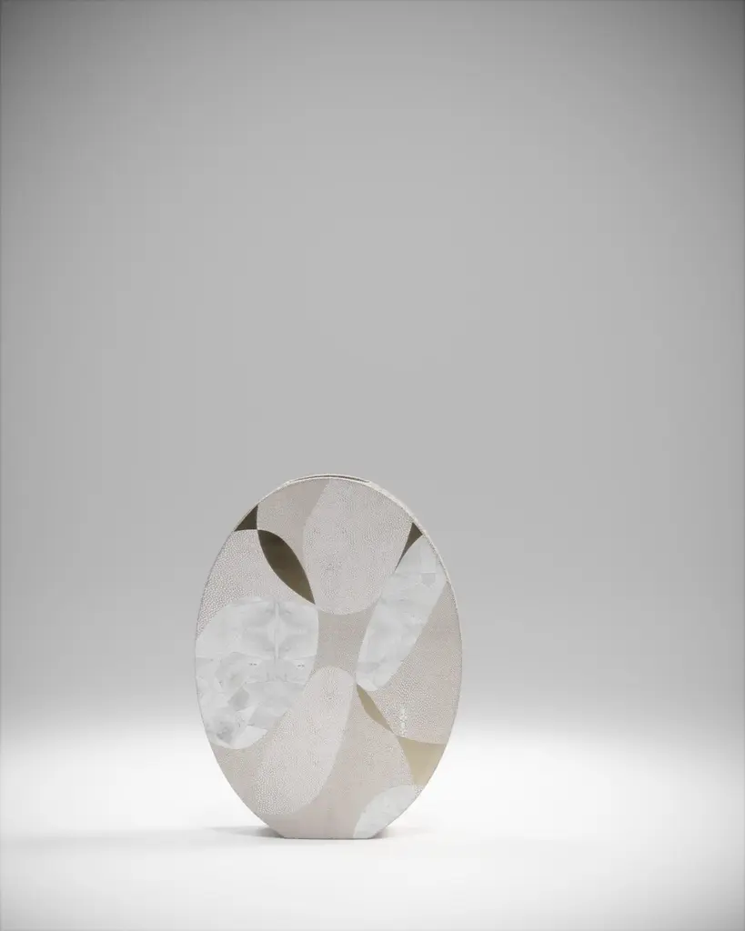 The Paris based label has distinguished themselves since their launch, with their iconic use of shagreen mixed with brass and other exotic materials. All furniture is handcrafted by skilled artisans, ultimately making each piece unique, designed in Paris and produced in the Philippines.The dancing peacock oval vase is a graphic piece that adds a statement to any space. The bold pattern is inlaid in a mixture of cream & white shagreen, mother of pearl and bronze-patina brass. The oval vase is lined with a fibre glass interior to support water. This listing is for the medium size with the light colour variant pattern, available in a large and dark colour way, see images at end of slide. The dimensions of this piece are 23 x 6 x 30 cm, the medium size is 30 x 7.5 x 40 cmAll R & Y Augousti pieces are handmade by artisans, ultimately making each piece unique.Wipe clean with soft dry cloth.Acclaimed design duo Ria & Yiouri Augousti have established themselves since the 1990s as pioneers of modern-vintage style through their luxurious Art Deco inspired collections.The Paris based label has distinguished themselves since their launch, with their iconic use of shagreen mixed with brass and other exotic materials. All furniture is handcrafted by skilled artisans, ultimately making each piece unique. All shagreen-covered items should be kept out of direct sunlight, color variants may occur on the stingray and other exotic finishes, but this showcases the Parisian label's commitment to creating authentic luxurious products using natural components.
