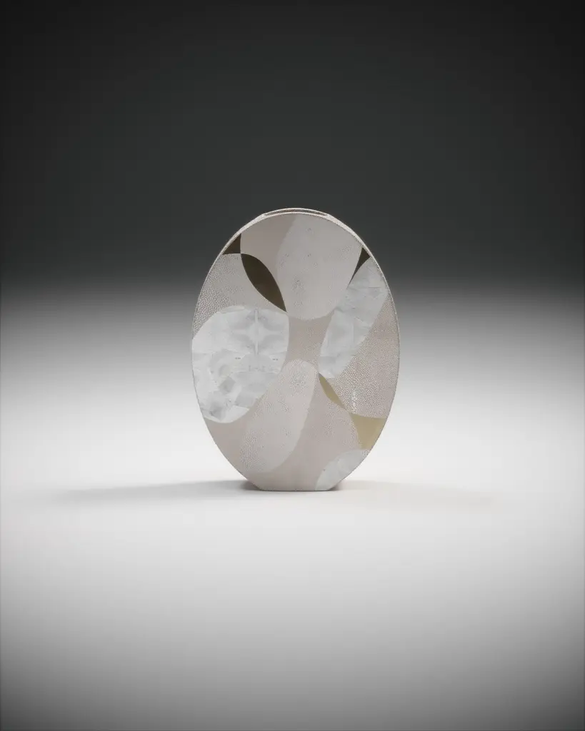 The Paris based label has distinguished themselves since their launch, with their iconic use of shagreen mixed with brass and other exotic materials. All furniture is handcrafted by skilled artisans, ultimately making each piece unique, designed in Paris and produced in the Philippines.The dancing peacock oval vase is a graphic piece that adds a statement to any space. The bold pattern is inlaid in a mixture of cream & white shagreen, mother of pearl and bronze-patina brass. The oval vase is lined with a fibre glass interior to support water. This listing is for the medium size with the light colour variant pattern, available in a large and dark colour way, see images at end of slide. The dimensions of this piece are 23 x 6 x 30 cm, the medium size is 30 x 7.5 x 40 cmAll R & Y Augousti pieces are handmade by artisans, ultimately making each piece unique.Wipe clean with soft dry cloth.Acclaimed design duo Ria & Yiouri Augousti have established themselves since the 1990s as pioneers of modern-vintage style through their luxurious Art Deco inspired collections.The Paris based label has distinguished themselves since their launch, with their iconic use of shagreen mixed with brass and other exotic materials. All furniture is handcrafted by skilled artisans, ultimately making each piece unique. All shagreen-covered items should be kept out of direct sunlight, color variants may occur on the stingray and other exotic finishes, but this showcases the Parisian label's commitment to creating authentic luxurious products using natural components.