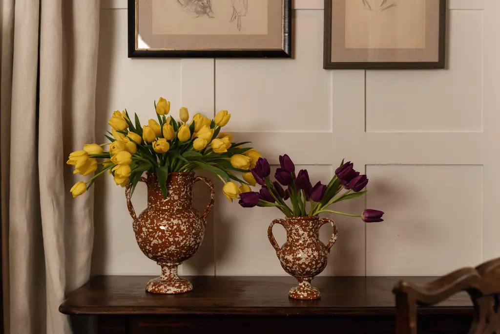 A standout centrepiece, the Verona vase is handmade in Italy. Our design comes in four colourways, choose from pink & blue, tan & ivory, terracotta & cream and yellow & verde. Available in two sizes: Regular and Large. Dishwasher safe.