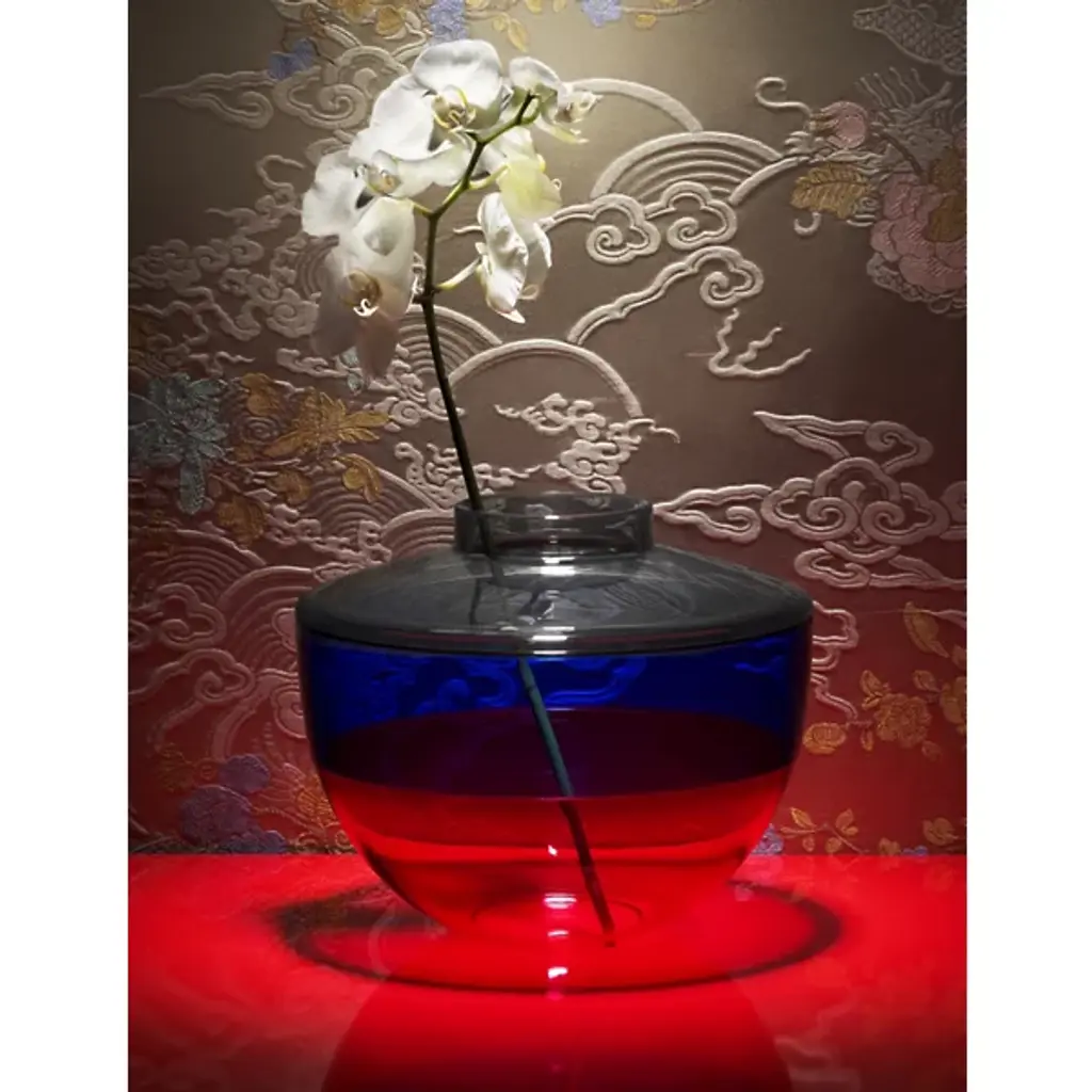 With its intense and seamless array of vibrant colors, the Kartell Shibuya Vase transcends its plastic material; it looks like glass blown in Murano. Obviously useful as a decorative object, Shibuya has a removable lid with a narrow opening for the arrangement of one or many flowers. Available in a range of tri-color palettes. Designed by Christophe Pillet.