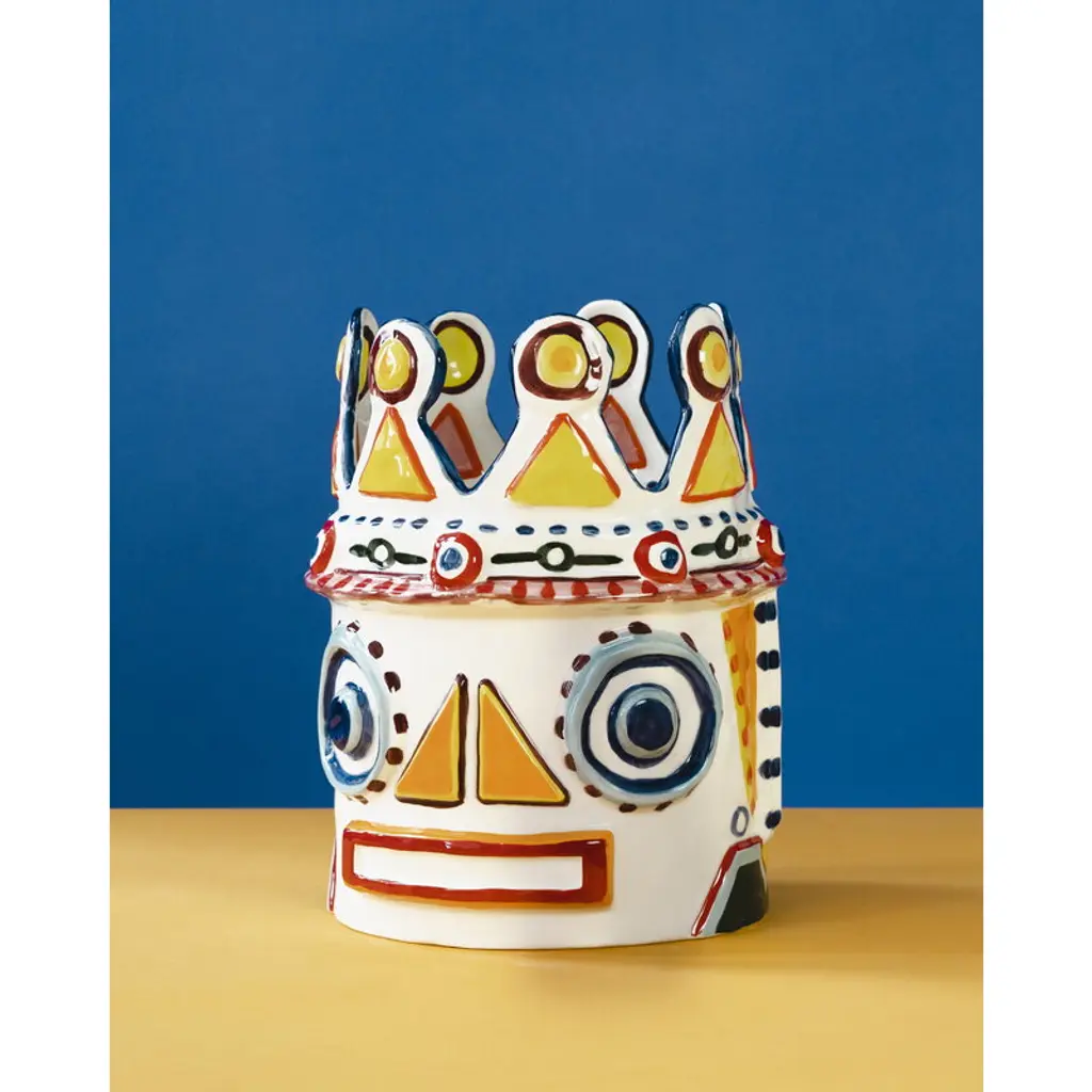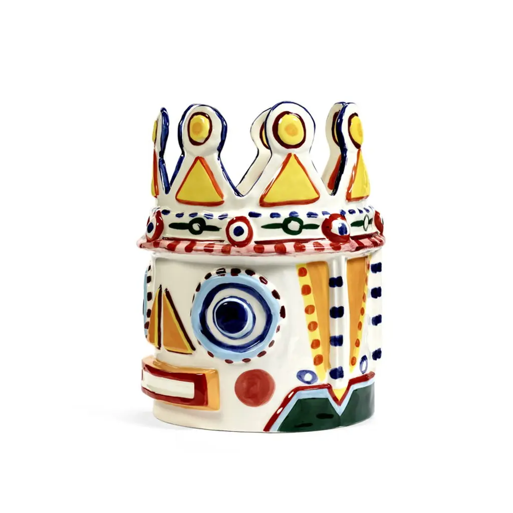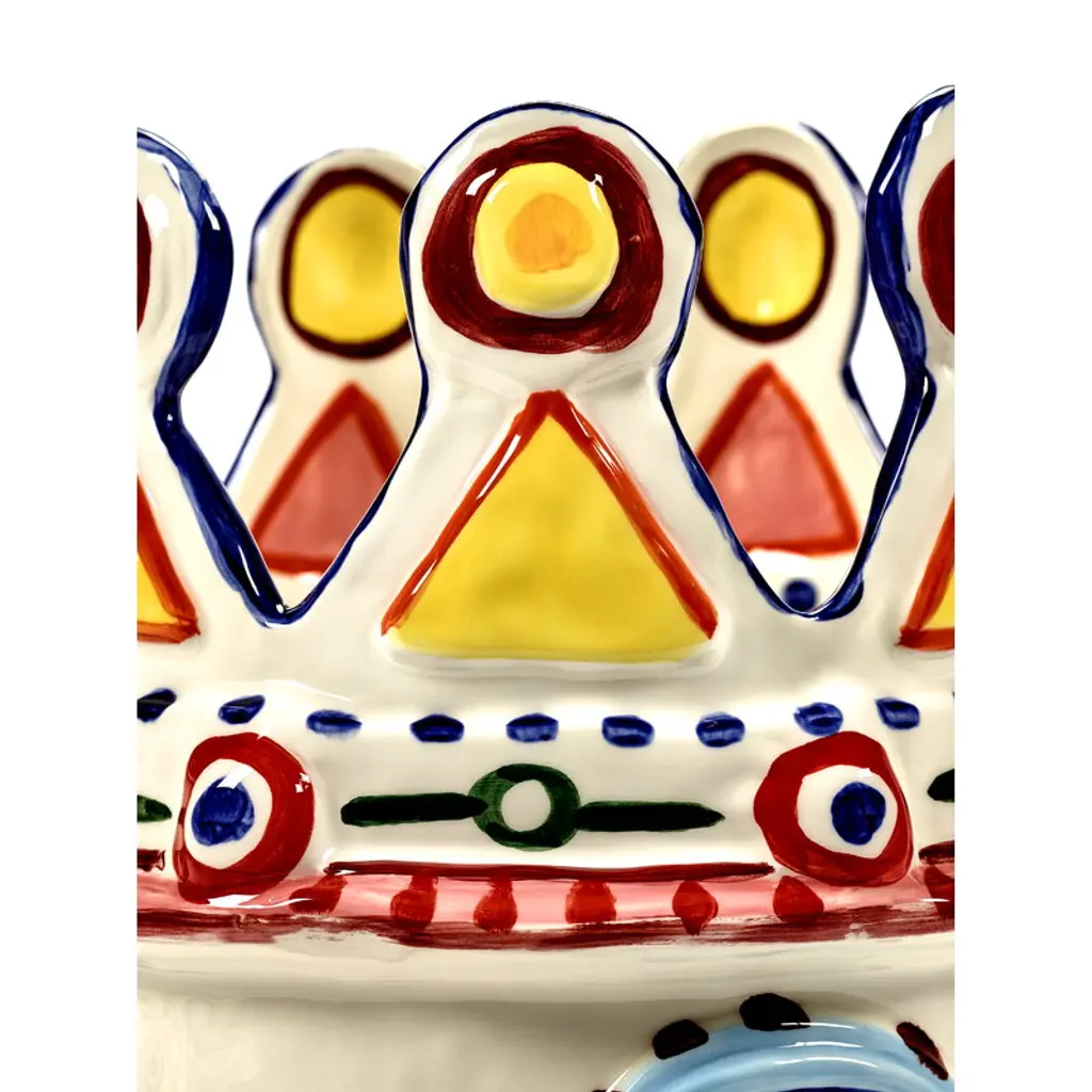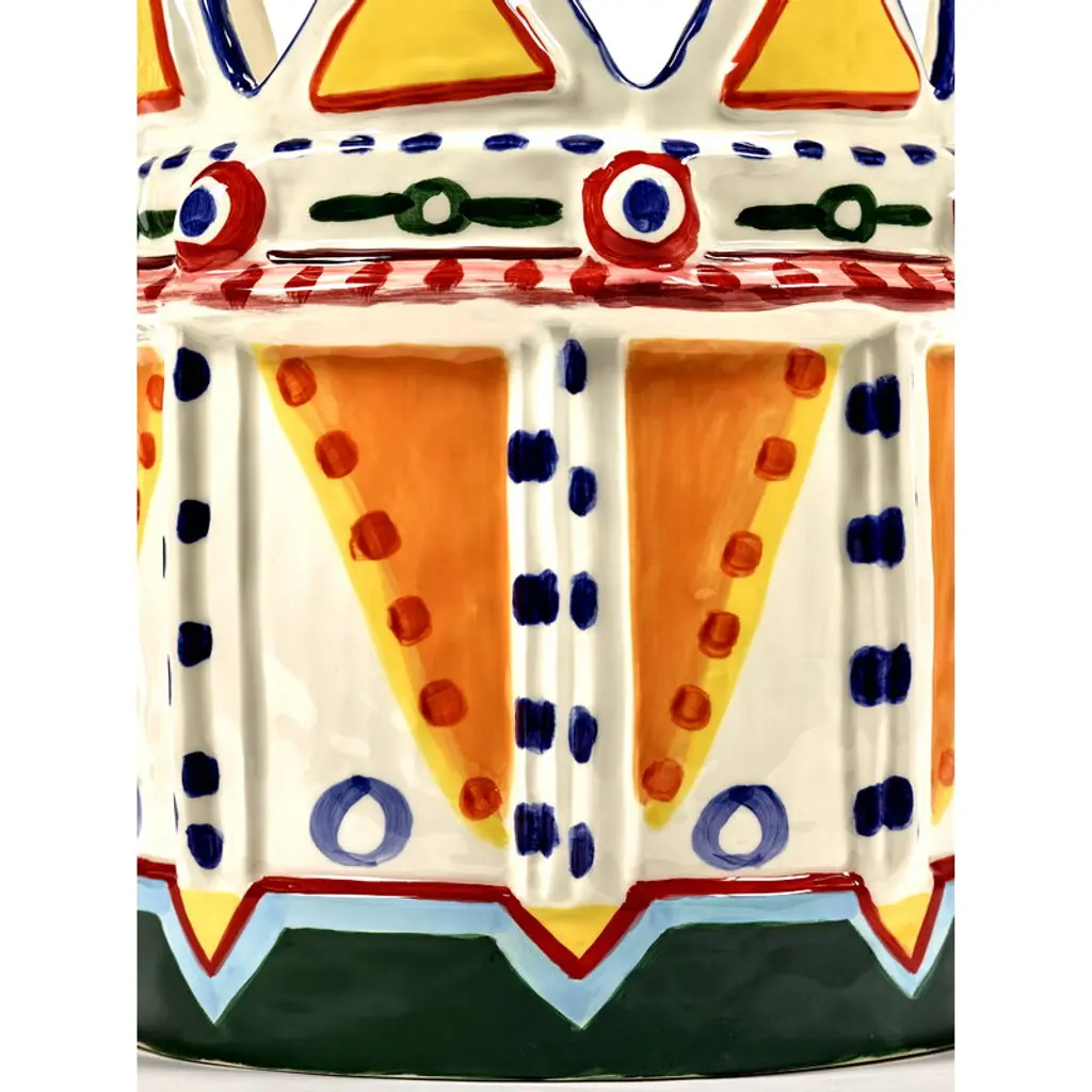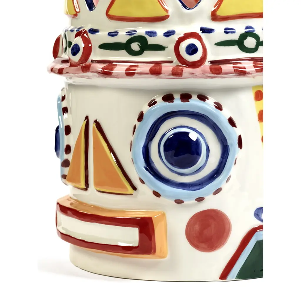 Serax's Sicily vase 02, the Otto King Fish, is a collaborative creation by renowned chef Yotam Ottolenghi and artist Ivo Bisignano. This fish-themed vase is adorned with vivid, hand-painted decorations, embodying the spirit of Sicily. These wildly surreal vases pay homage to Ottolenghi's colorful culinary artistry and the ceramic Testa di Moro figures native to Bisignano's Sicilian homeland, which often grace local balconies. The large, richly decorated Sicily vases are perfect both as bookshelf ornaments and as stunning centerpieces for table settings, bringing a generous splash of Sicilian sunshine to any space.