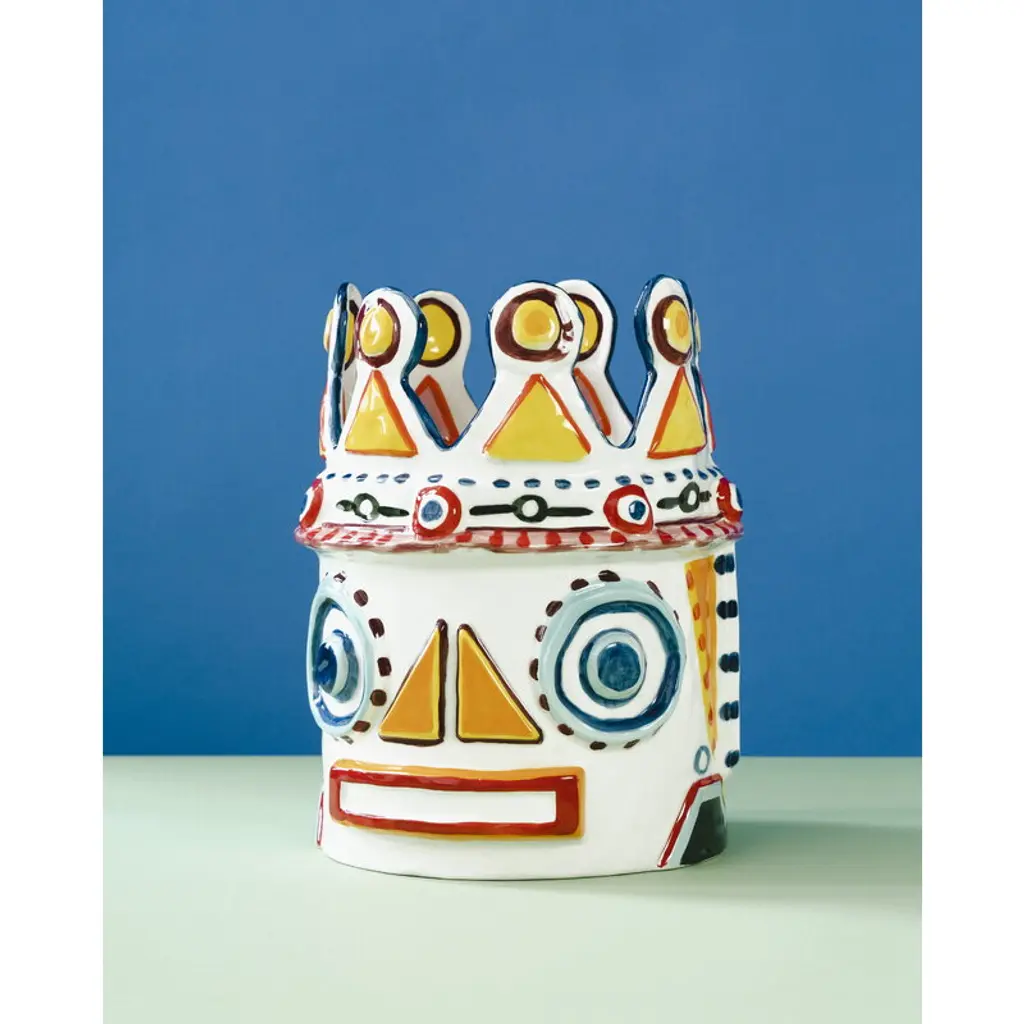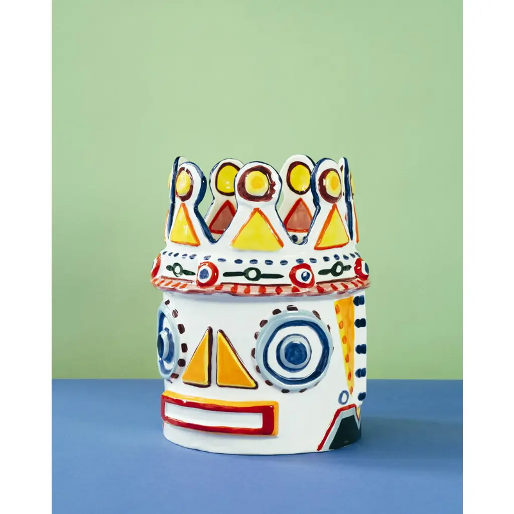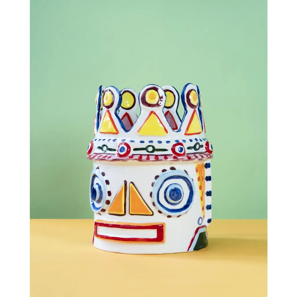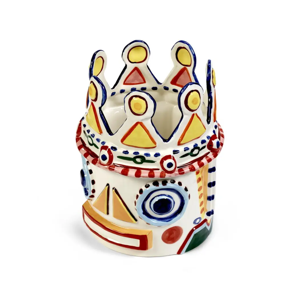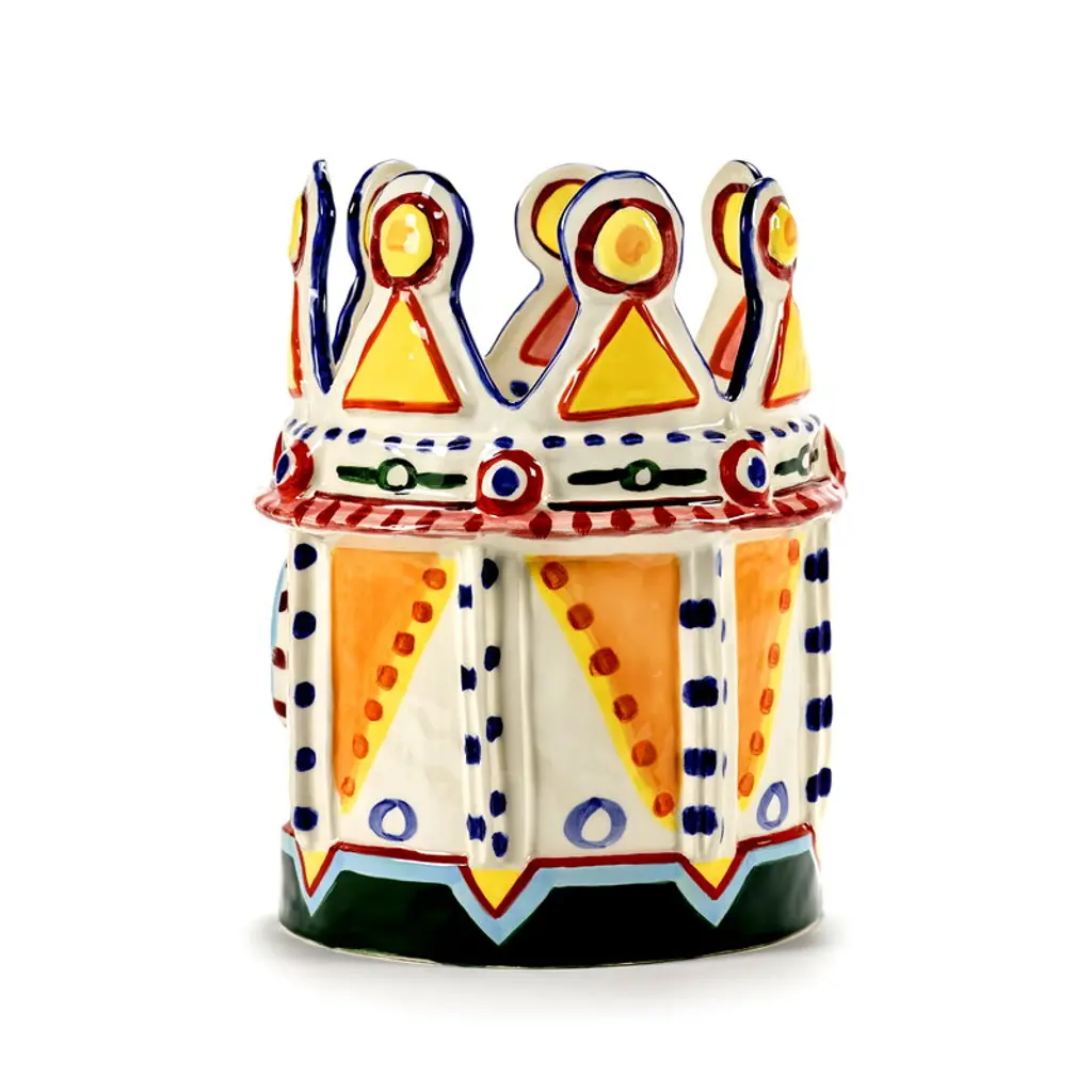 Serax's Sicily vase 02, the Otto King Fish, is a collaborative creation by renowned chef Yotam Ottolenghi and artist Ivo Bisignano. This fish-themed vase is adorned with vivid, hand-painted decorations, embodying the spirit of Sicily. These wildly surreal vases pay homage to Ottolenghi's colorful culinary artistry and the ceramic Testa di Moro figures native to Bisignano's Sicilian homeland, which often grace local balconies. The large, richly decorated Sicily vases are perfect both as bookshelf ornaments and as stunning centerpieces for table settings, bringing a generous splash of Sicilian sunshine to any space.
