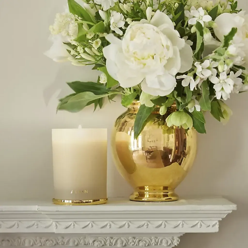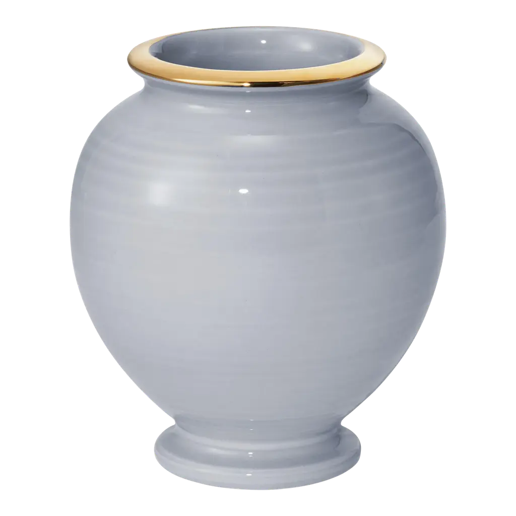 The Siena Vase from AERIN features a wide opening perfect for full bouquets and larger arrangements. Each vase is hand-thrown on a potter's wheel, creating surface variations and gentle ribbing that show the artisan's work. The generous rim has been enhanced with hand-painted detailing, adding a finishing touch to the ceramic form. This vase's proportions make it suitable for tall stems and sprawling arrangements, while its handcrafted nature ensures no two pieces are identical.