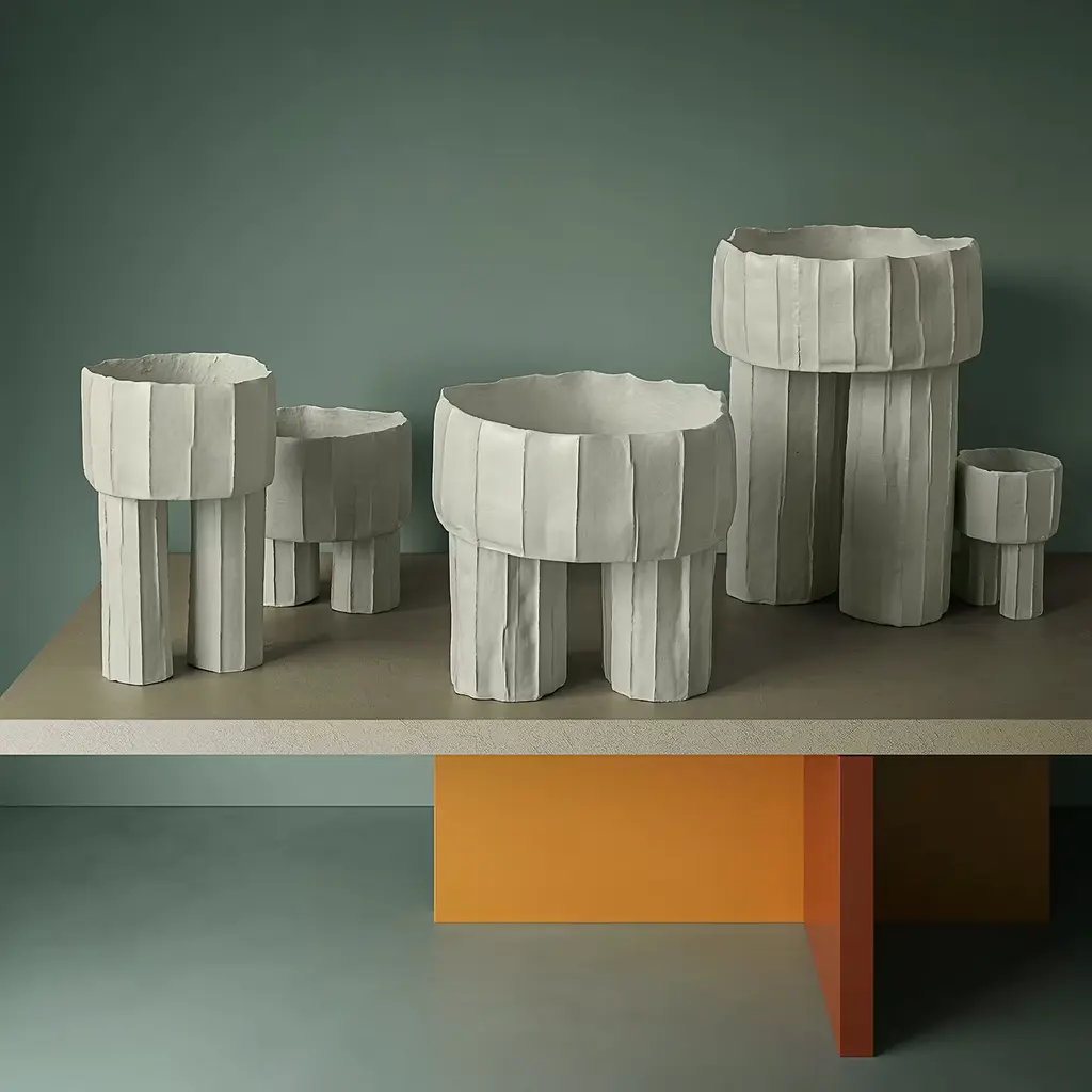 Every one of Paola Paronetto’s creations is unique. From her exclusive clay mix, to the opaque and natural colour finish, each piece is completely handmade. Slight variations in shape, colour and size are to be considered a guarantee of authenticity and value. They are finished with non-toxic satin-finish enamels. Although very rarely, it is possible for them to leak after long periods of exposure to water. It is therefore advisable to test their water resistance before using them on delicate surfaces. They should not be used as dining utensils. The white pieces can be washed with water or sanitizing products, whereas the coloured pieces must be treated more gently and cleaned with a feather duster or a soft cloth, dry or moistened very slightly with water.