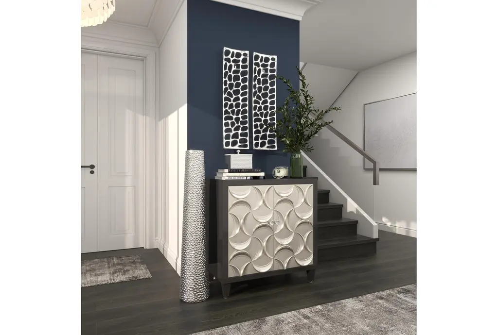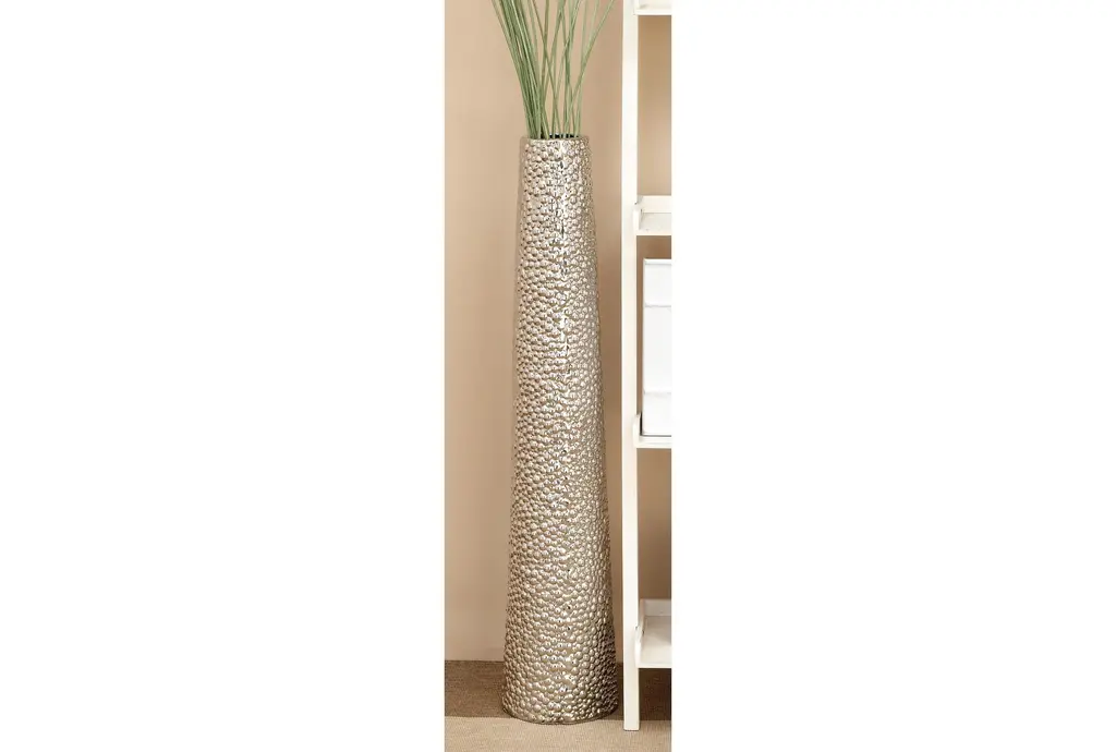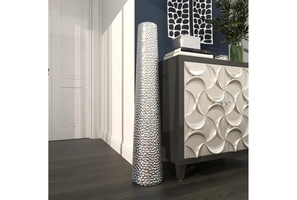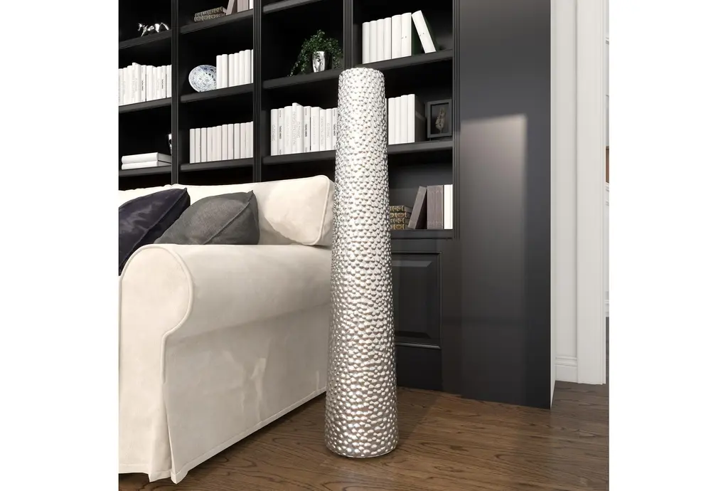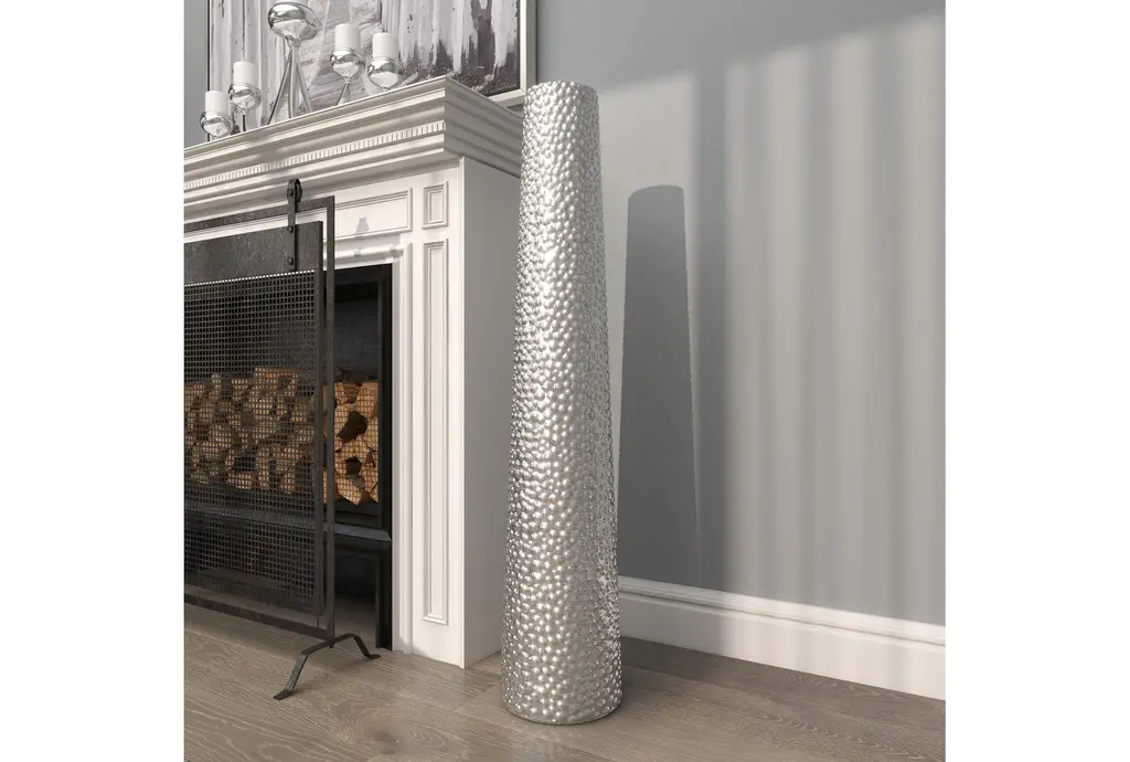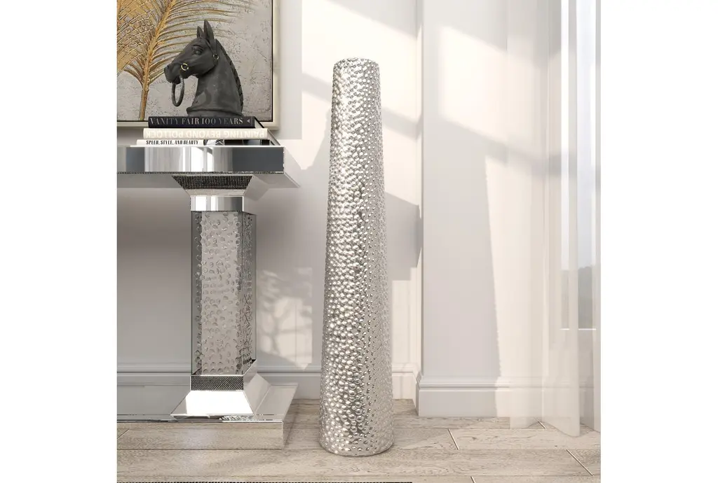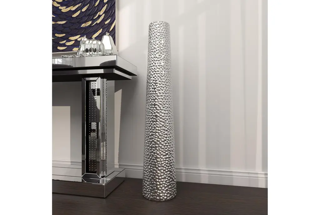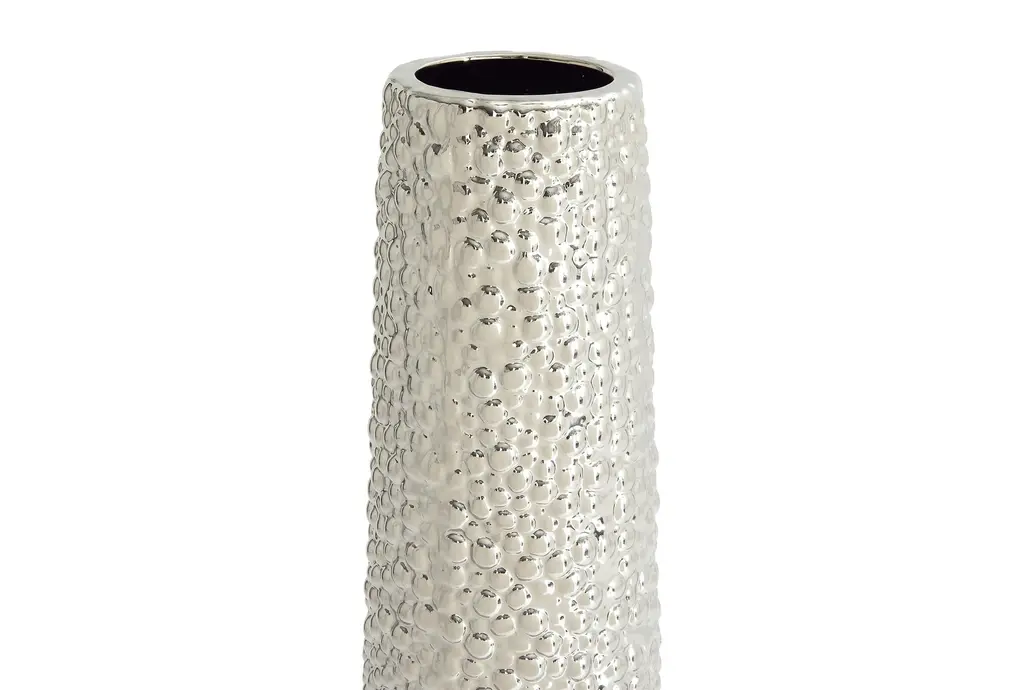 Dazzle your home corners with this tall beaded metallic silver cylinder ceramic vase. Slightly tapered, this cylinder floor vase is made with pure ceramic and highlights a beaded texture with high shine metallic silver finish. Placed as a decorative or functional accent piece in your dining or living room, hallways or entryways, this floor vases is a fashionable complement to any of your contemporary glam-themed home spaces. Suitable for indoor use only. floor vase measures 3” mouth openings. This item comes shipped in one carton.