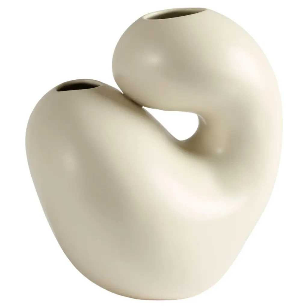 Handcrafted from sturdy ceramic, this vase is composed of four capsule-shaped segments, which cluster together into a sculptural + organic silhouette. The double openings invite floral arrangements that play with dimension + contrast, while a matte white glaze keeps the focus on form.