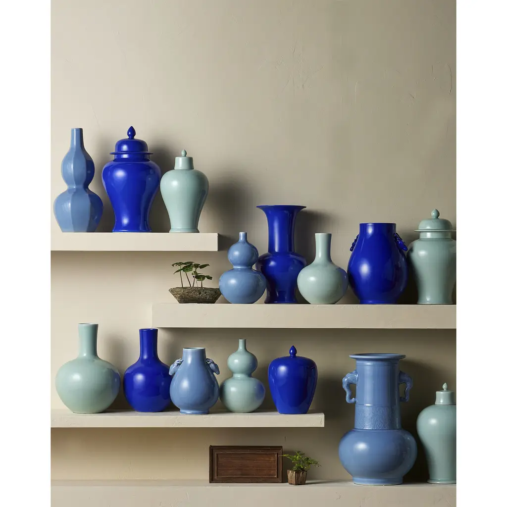 The Sky Blue Elephant Handles Vase is created from the most aristocratic and precious porcelain that have been made for centuries, the blue celadon making this a striking decorative accessory. The skills to create and the secrets that make the lustrous blue vases so special have been perfected by artisan families for generations. Though the term celadon inspires many people to envision green surfaces, within China there are both green and blue versions of this time-honored technique.