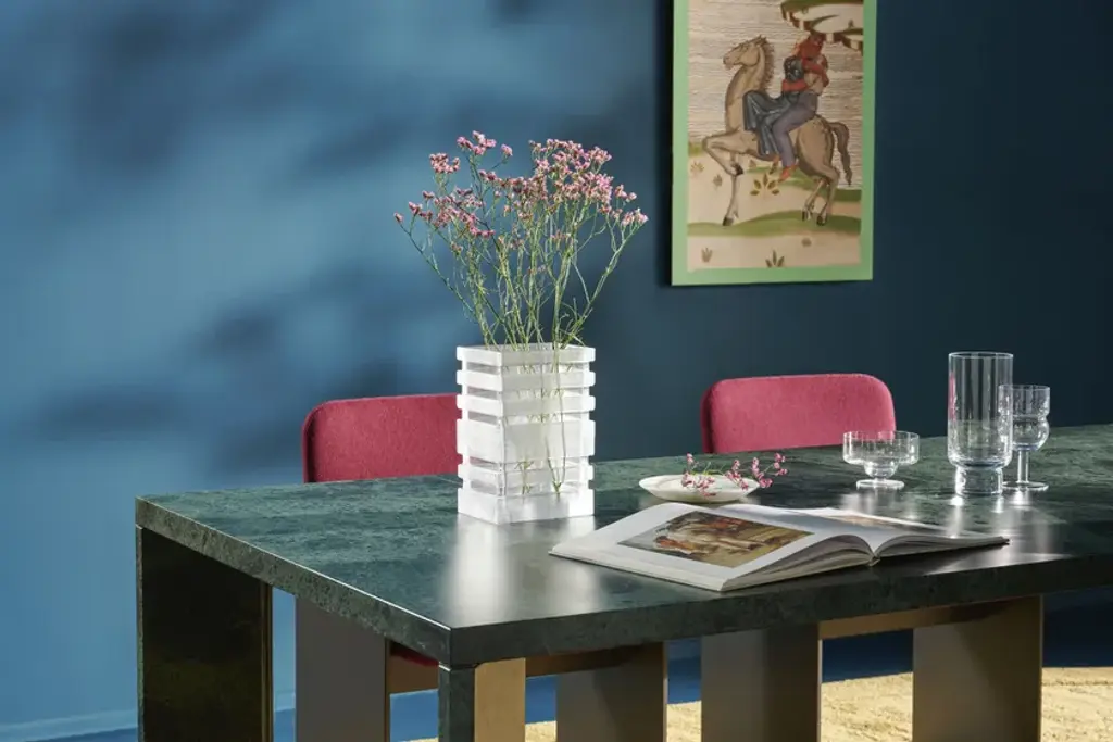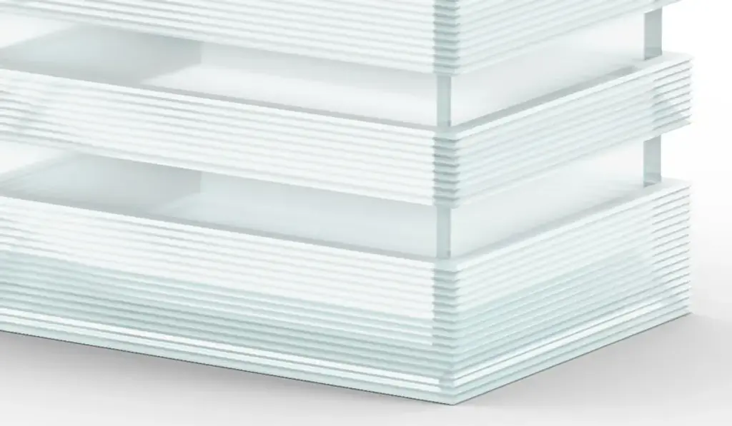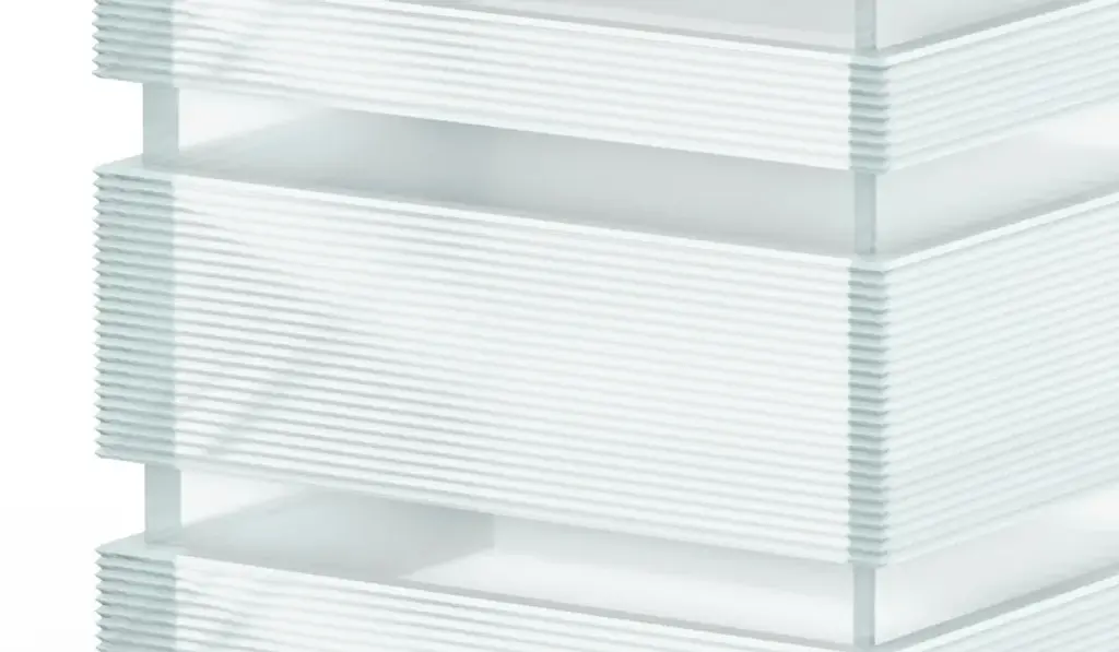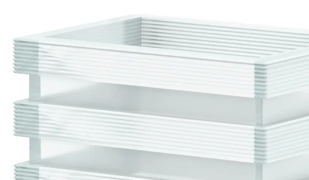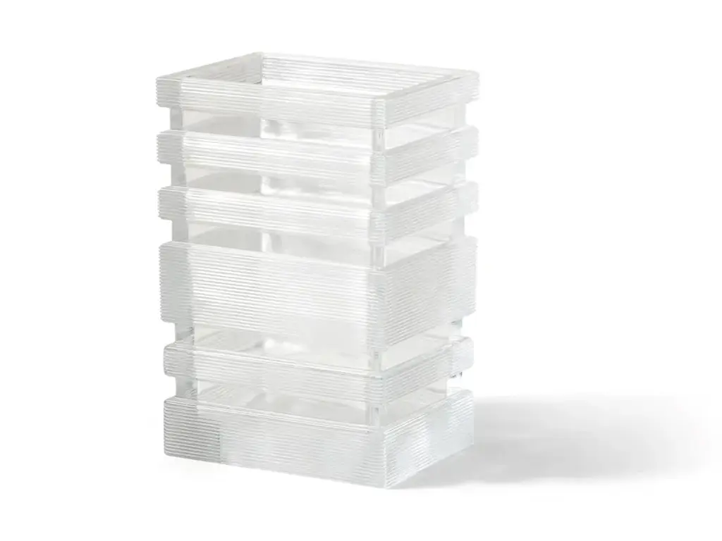 In this re-edition of the vase designed by Bodil Kjær in the early 1960s, architecture is the key feature. Its transparency magnifies the complex shape of the object, reminiscent of a skyscraper. Its sculptural shape is achieved through a particularly complex glass process requiring excellent artisan skills. Skyscraper is made of transparent glass mechanically pressed into a cast-iron mould to create the shape of a building and its elegant architectural details, an extremely arduous process, due to the considerable thickness of the glass.“Cassina” logo sandblasted into the base. Transparent pressed glass accents the complex shape of the object. The thickness of the glass lends value and importance to the piece.