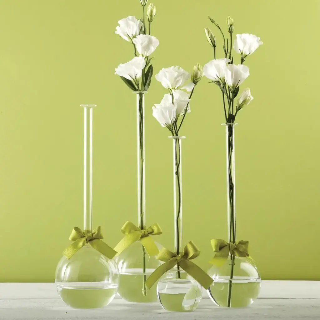 Like little gifts sprouting a flower or greenery, this set of four designs is made from hand-blown glass. Unlike traditional vases, the stunning designs feature a unique green ribbon detail that can be updated to fit any look or décor.