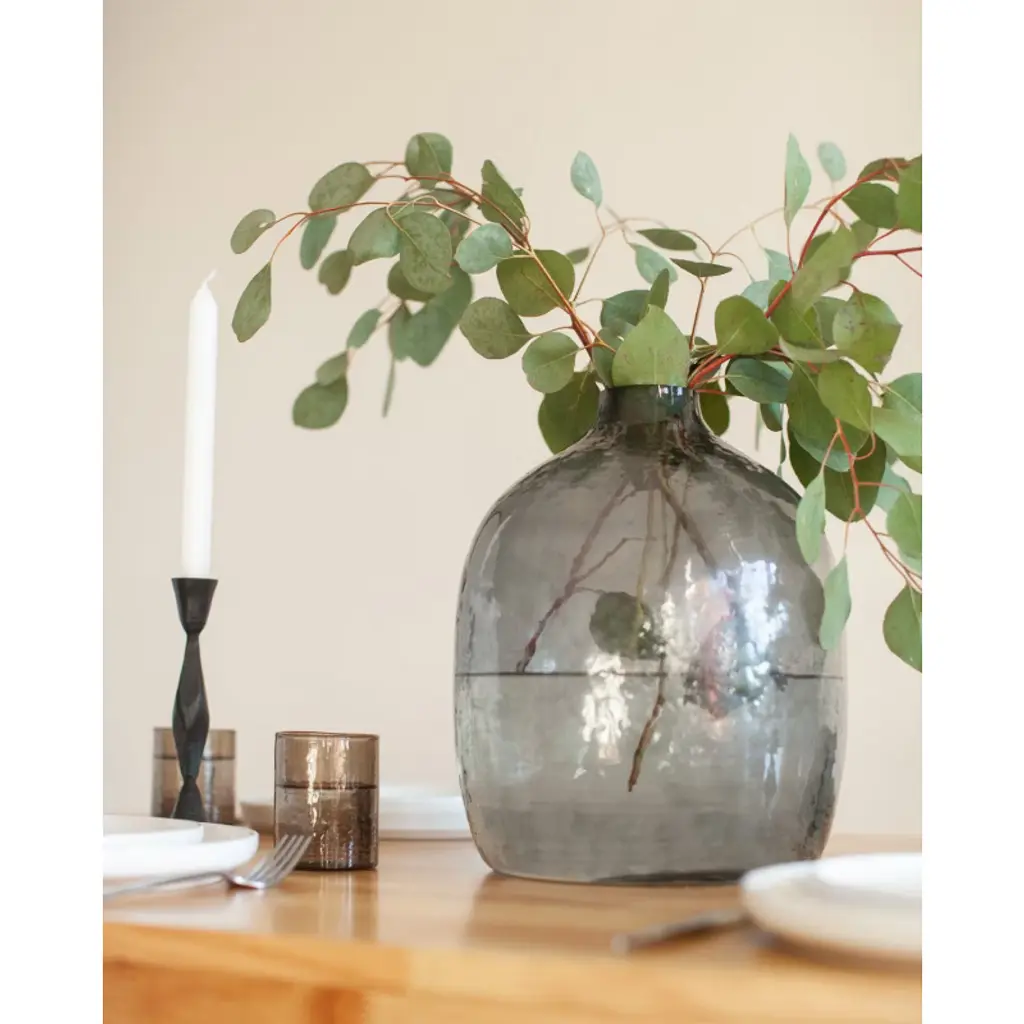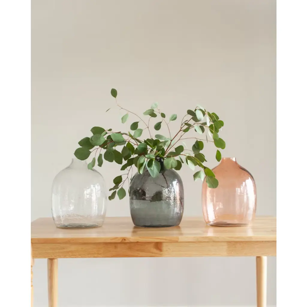 Elevate your décor with the Handblown Hammered Glass Hebron Vase, a striking piece that balances artistry and function. Designed with a subtle hammered texture, this vase reflects light beautifully while adding dimension to any room. Available in Blush, Clear, or Blue Grey, it complements a wide range of interiors and styles. Crafted using traditional glassblowing techniques, each vase is individually shaped by artisans, making every piece one-of-a-kind. Its versatile 10 x 10 x 12-inch size makes it ideal for showcasing fresh florals, dried stems, or standing alone as a sculptural accent. Due to its handcrafted nature, slight variations in size and color enhance its unique character. For lasting beauty, handwash only.