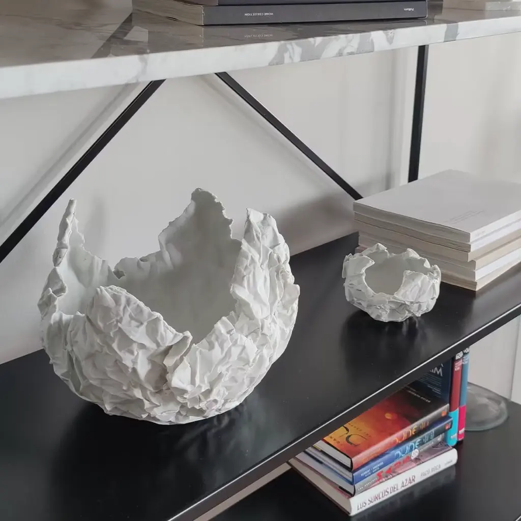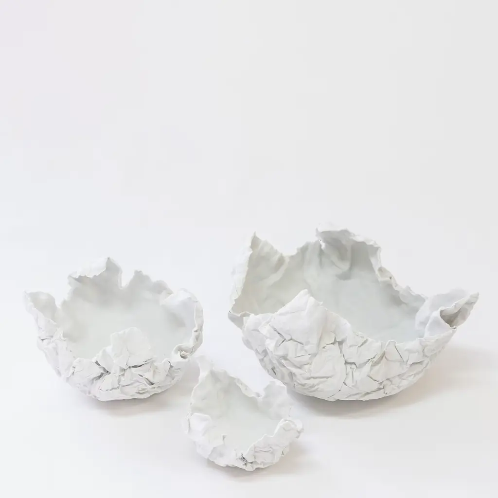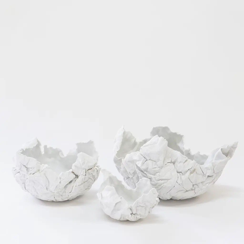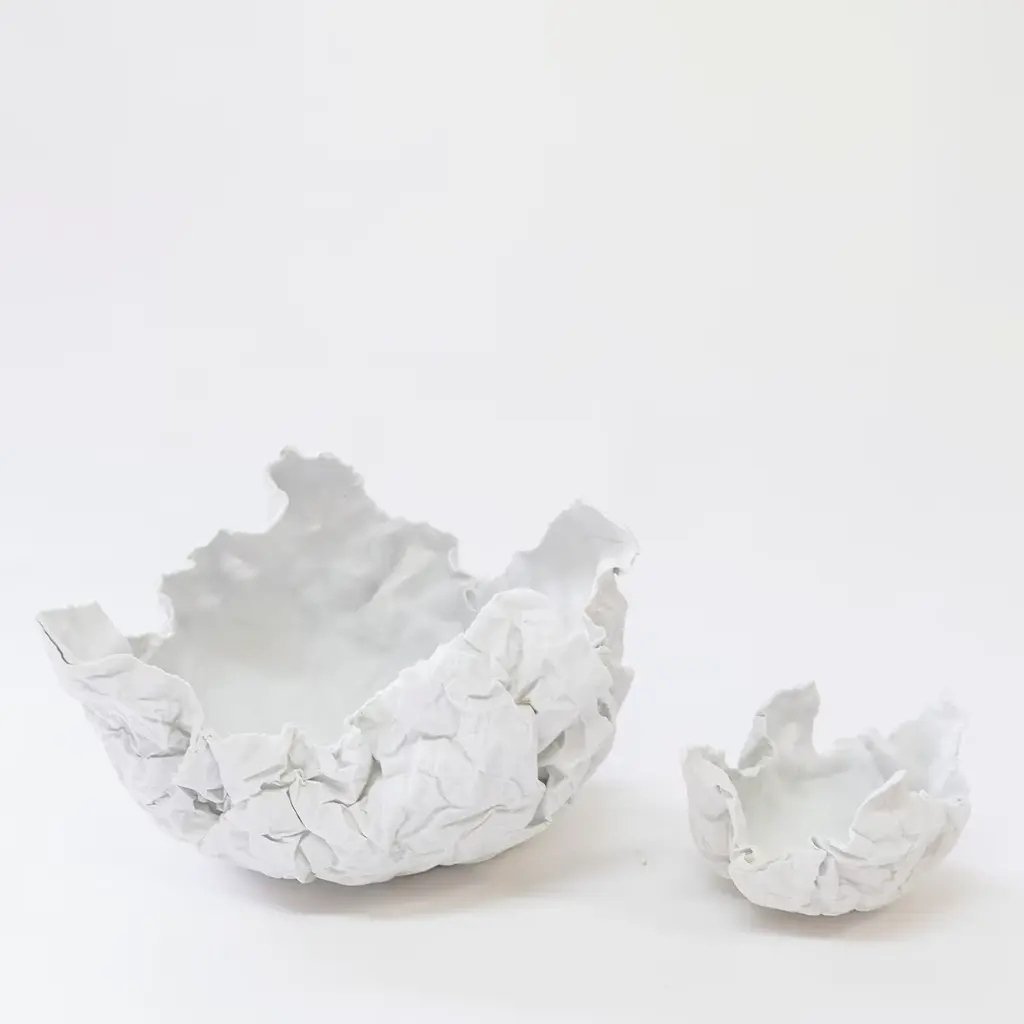 Fine paper-like vessel in sugary porcelain biscuit. The Come Carta series is characterized by an unglazed and sensual touch surface resembling a crumpled piece of paper. Which message was it carrying? Which story can still be written on it? A vessel that contains your emotions. The series comes in three different measures: 12 x h 10 cm, 20 x h 15 cm, 27 x h 20 cm approx. Each piece is unique, and due to handcrafting, slight changes may occur.