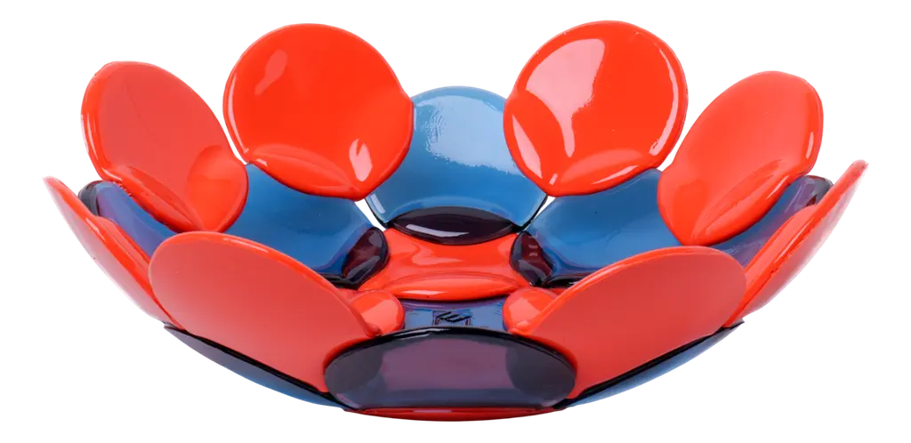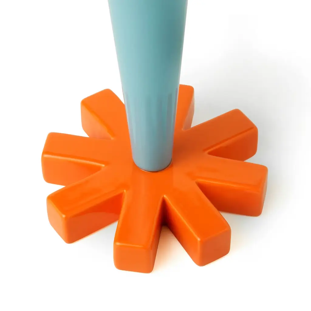 This striking, multicolored vase in white clay features a mouth in the shape of a cross. The outside of the cross is finished in vivid yellow with an orange top edge, while the interior is in green with a dark bottom. This piece was design in 2006 by Rashid Karim and it is part of a limited series of 349 pieces.