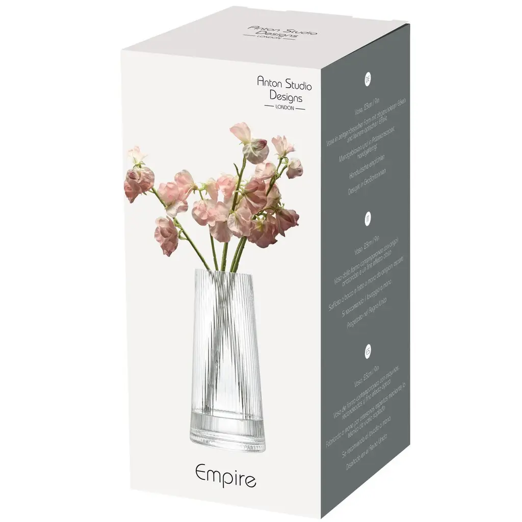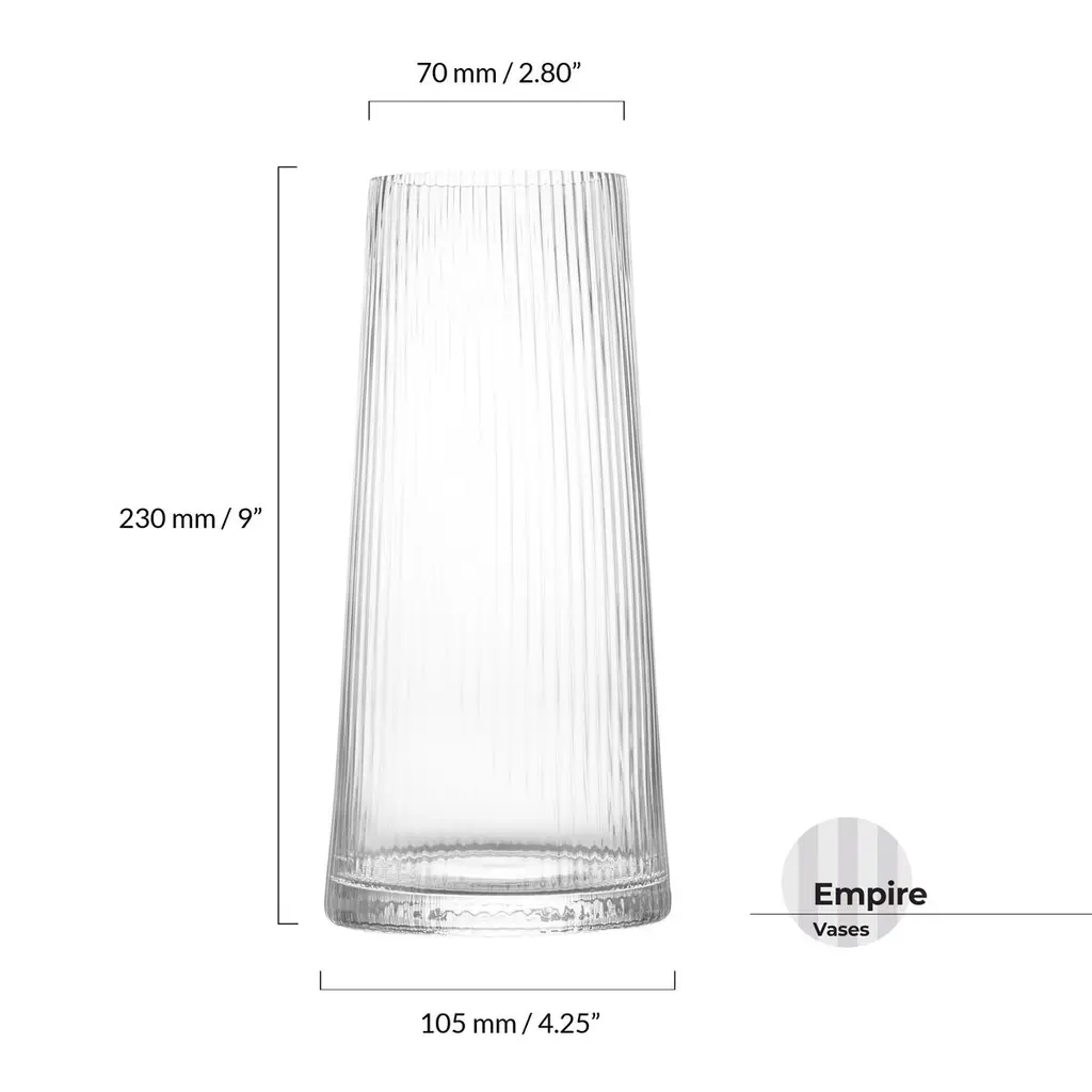 With its narrow optic detailing, the Empire Small Vase plays with light and texture to create a sophisticated effect. Ideal for single stems or delicate greenery, it adds understated elegance to any room.