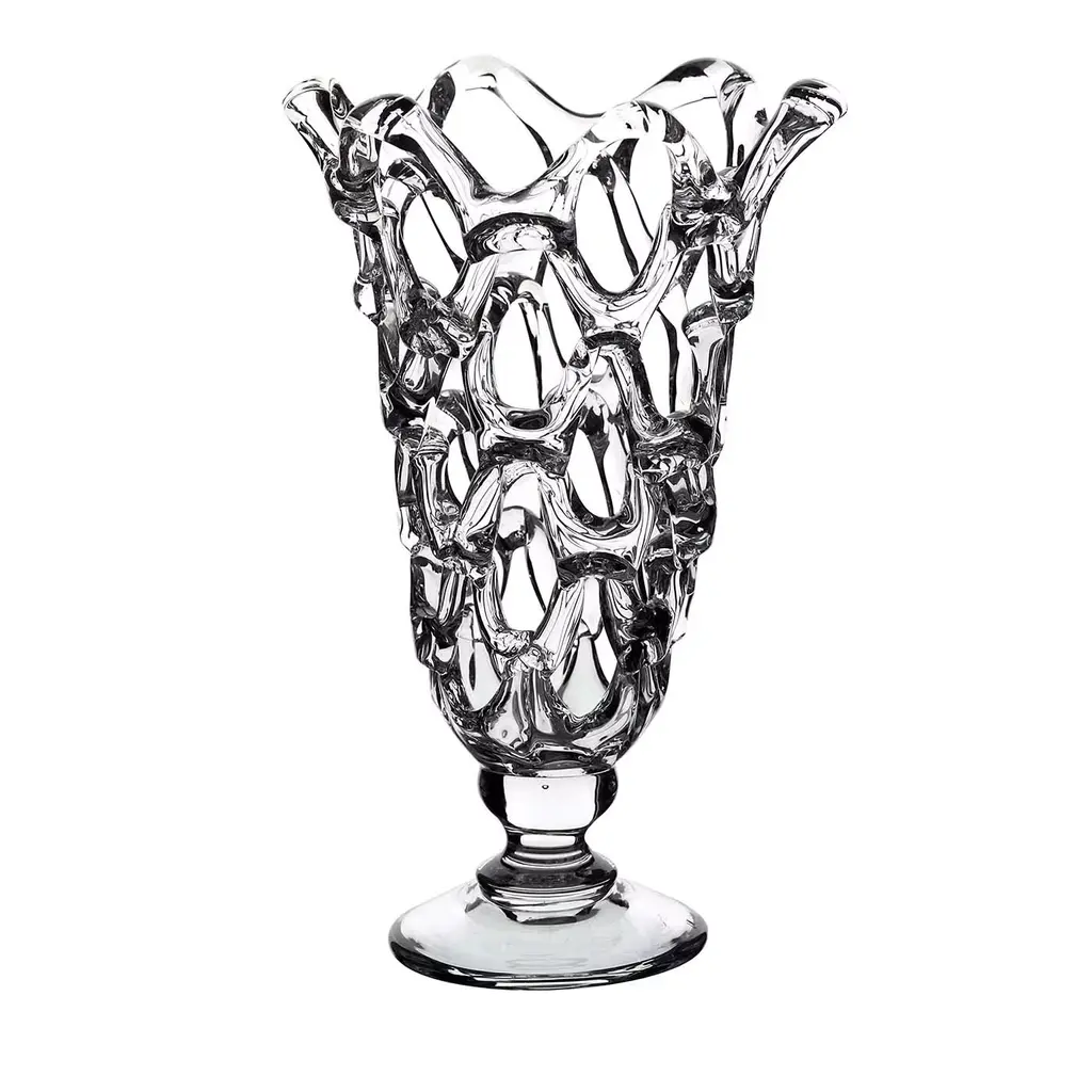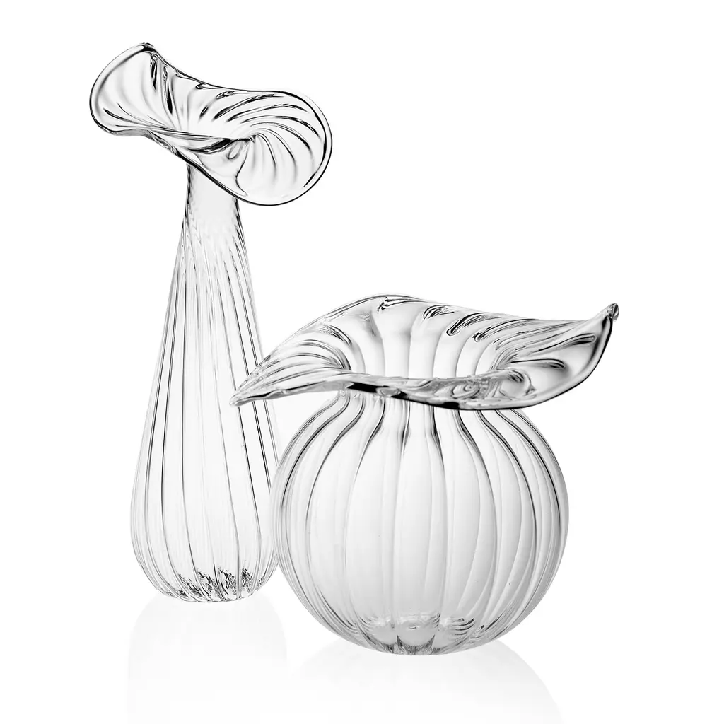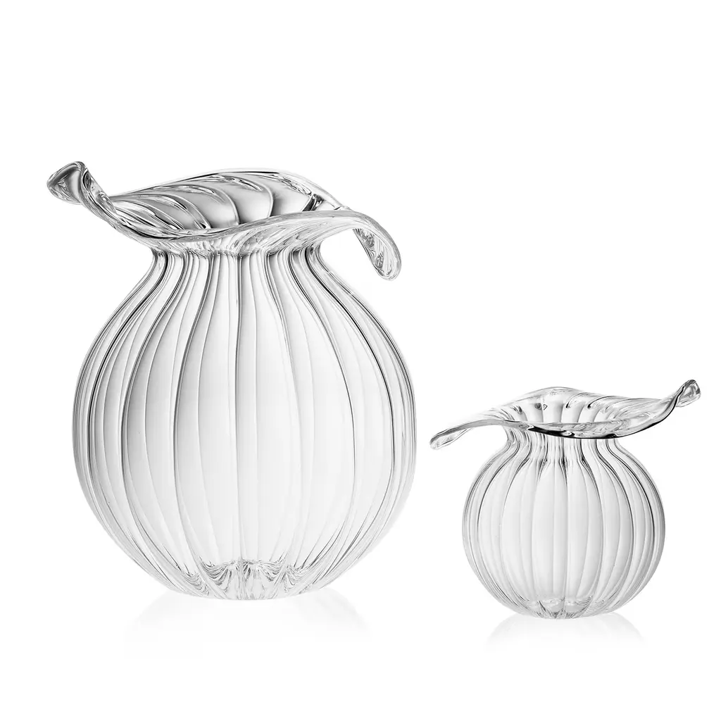 The Small Millerighe Round vase epitomizes refined elegance and artistic craftsmanship. This exquisite vase, inspired by the delicate form of a leaf gently poised in the air, features a sinuous silhouette and a captivating striped surface that harkens back to the opulence of traditional Italian design. The intricate 'millerighe' patterning gracefully enhances the curvature of the vase, while its upper section unfurls like a peacock’s tail, drawing attention with its ambitious flourish. Each piece serves not only as a functional item but also as a striking statement of decor, perfect for showcasing floral arrangements or standing alone as a work of art. Meticulously crafted, this vase celebrates the rich heritage of Italian glass manufacturing, with each creation reflecting the skill and passion of expert artisans. Ideal for those seeking to infuse their home with a touch of sophistication, the Small Millerighe vase is a stunning addition to any interior space.