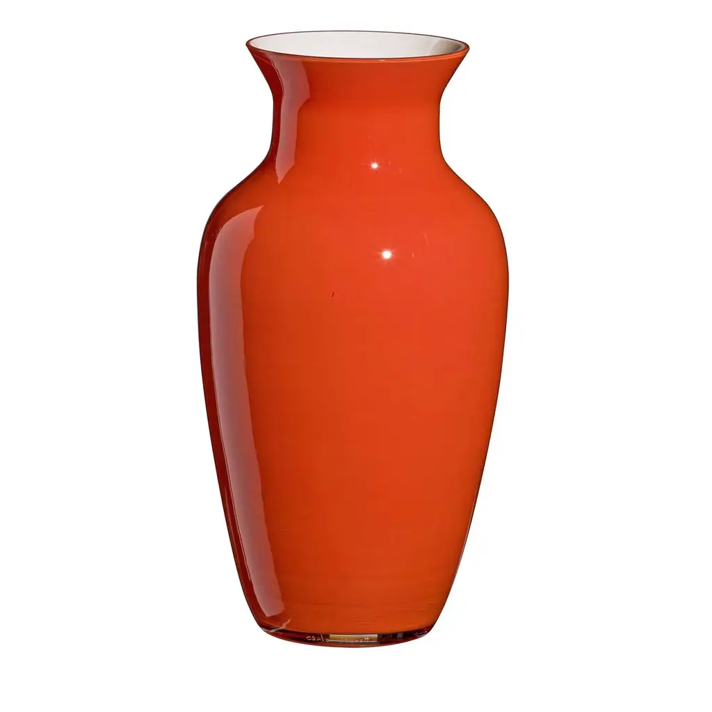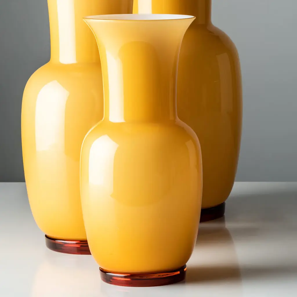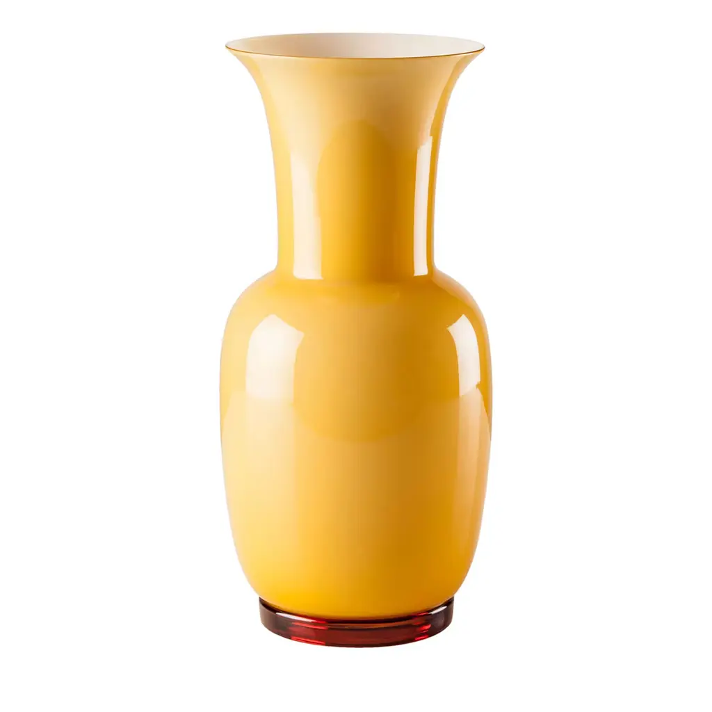 This splendid vase merges tradition and modern flair in one unique piece first designed in 1932. Distinguished for its purely elegant flair, it is superbly handcrafted of mouth-blown Murano glass boasting an opaline yellow tone juxtaposed to the transparent red of the base. Timeless and versatile, this piece will infuse sophistication in any decor.