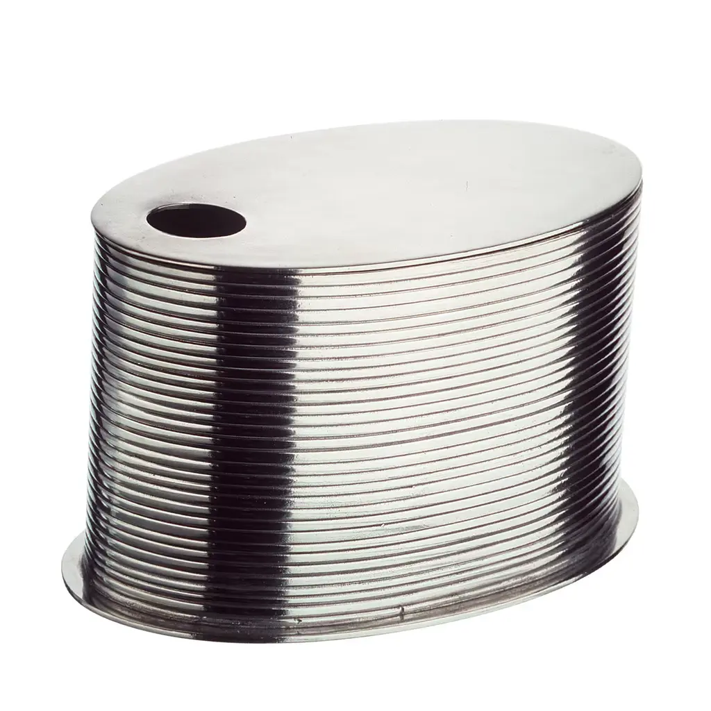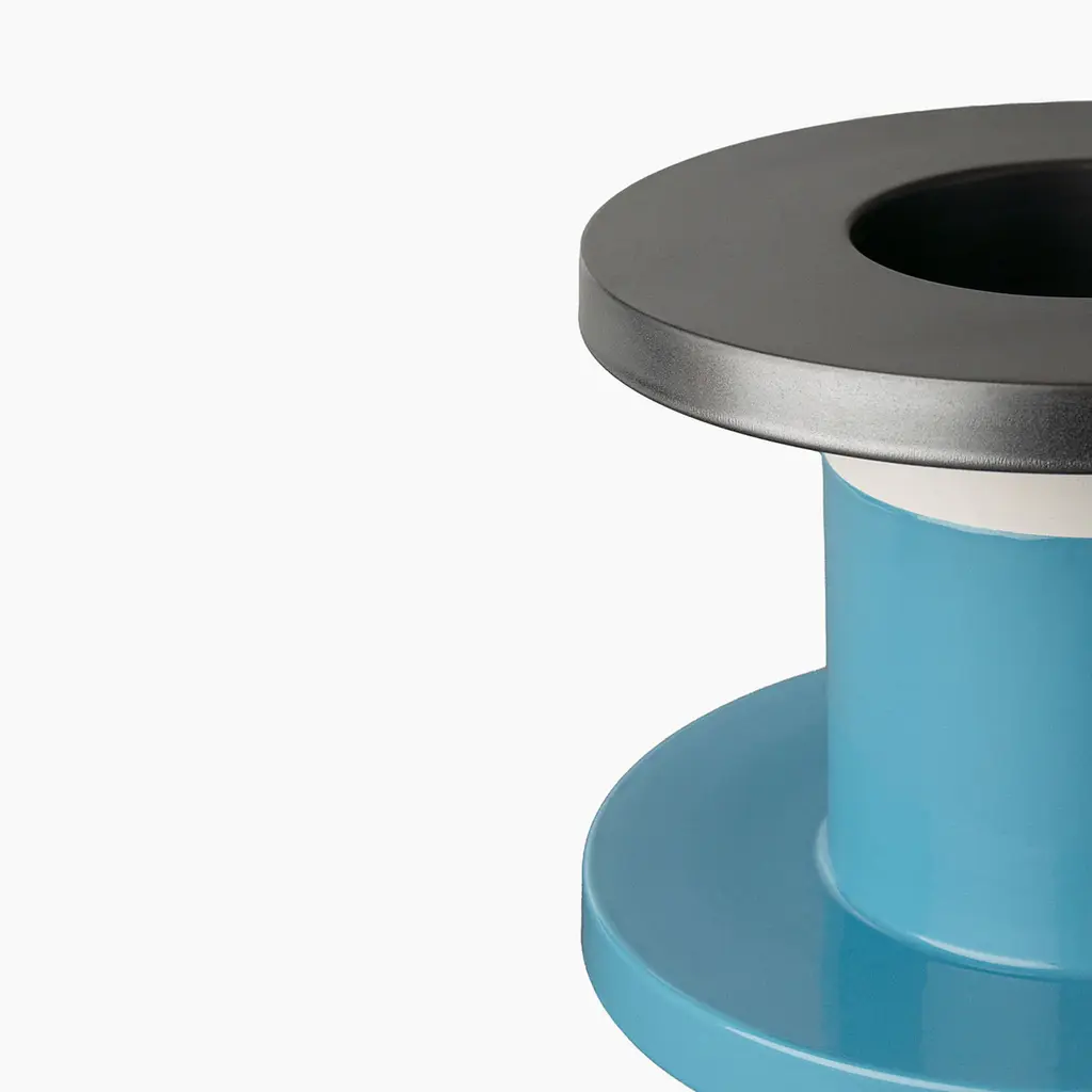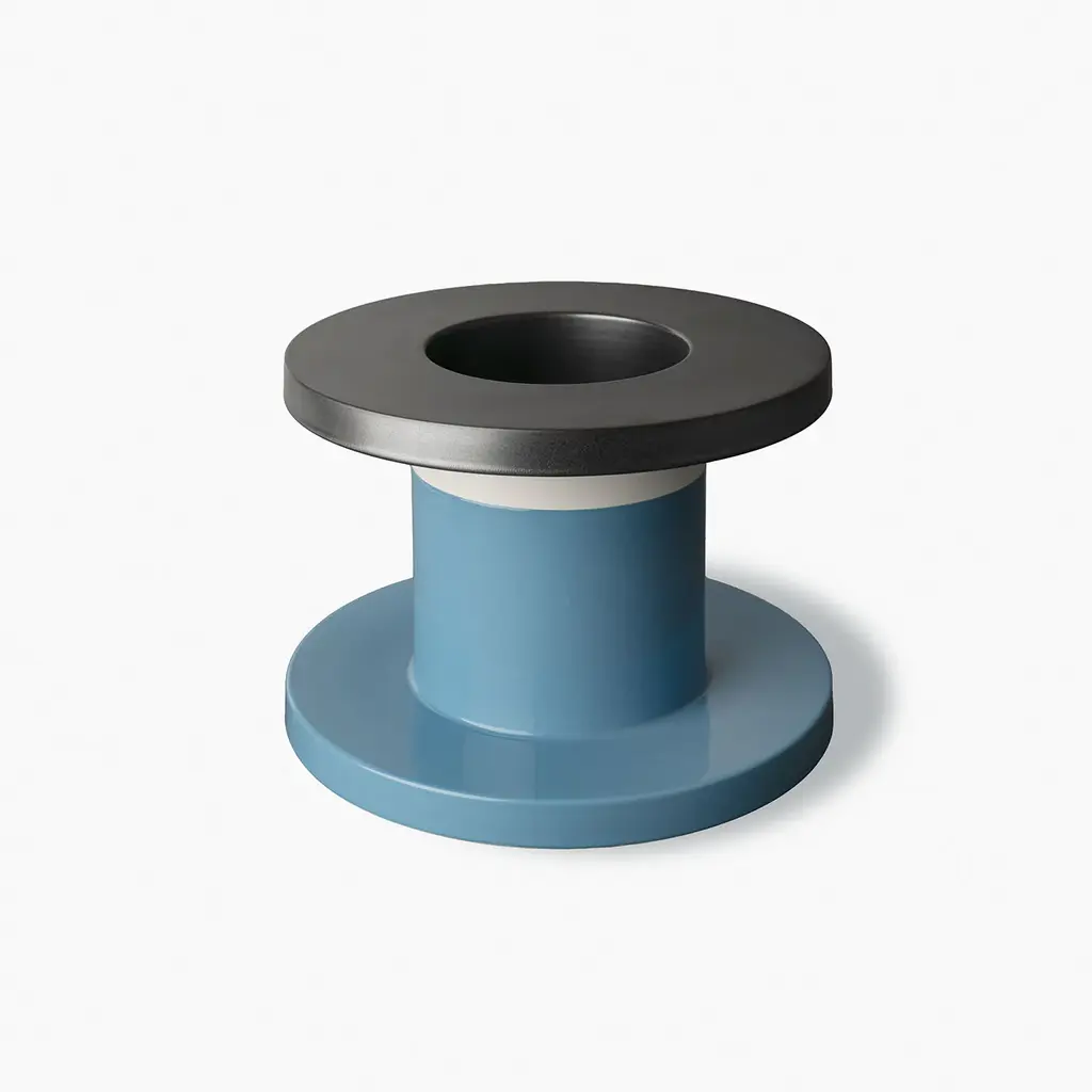 Designed by the Italian architect Ettore Sottsass for Bitossi as part of an exclusive collection, this unconventional vase is composed of a cylinder enclosed between two disks. Its minimalist shape is highlighted by a color block decoration that features a soft blue glossy finish for base and body, and solid black matte finish for the top. The result is a striking effect that gives the piece a modern allure.