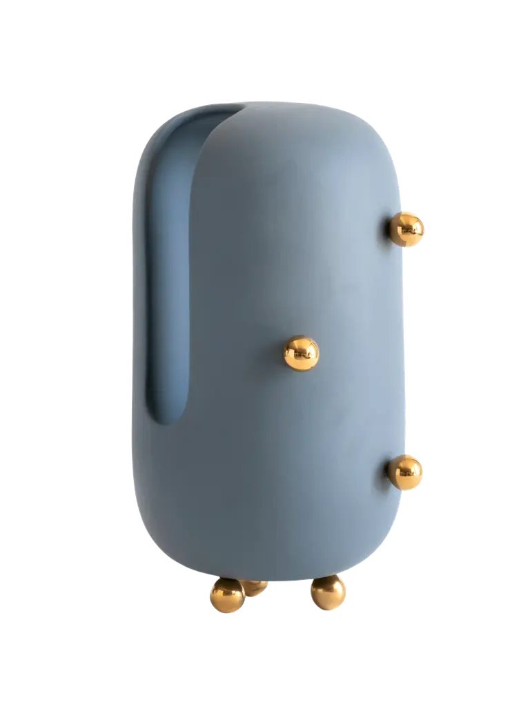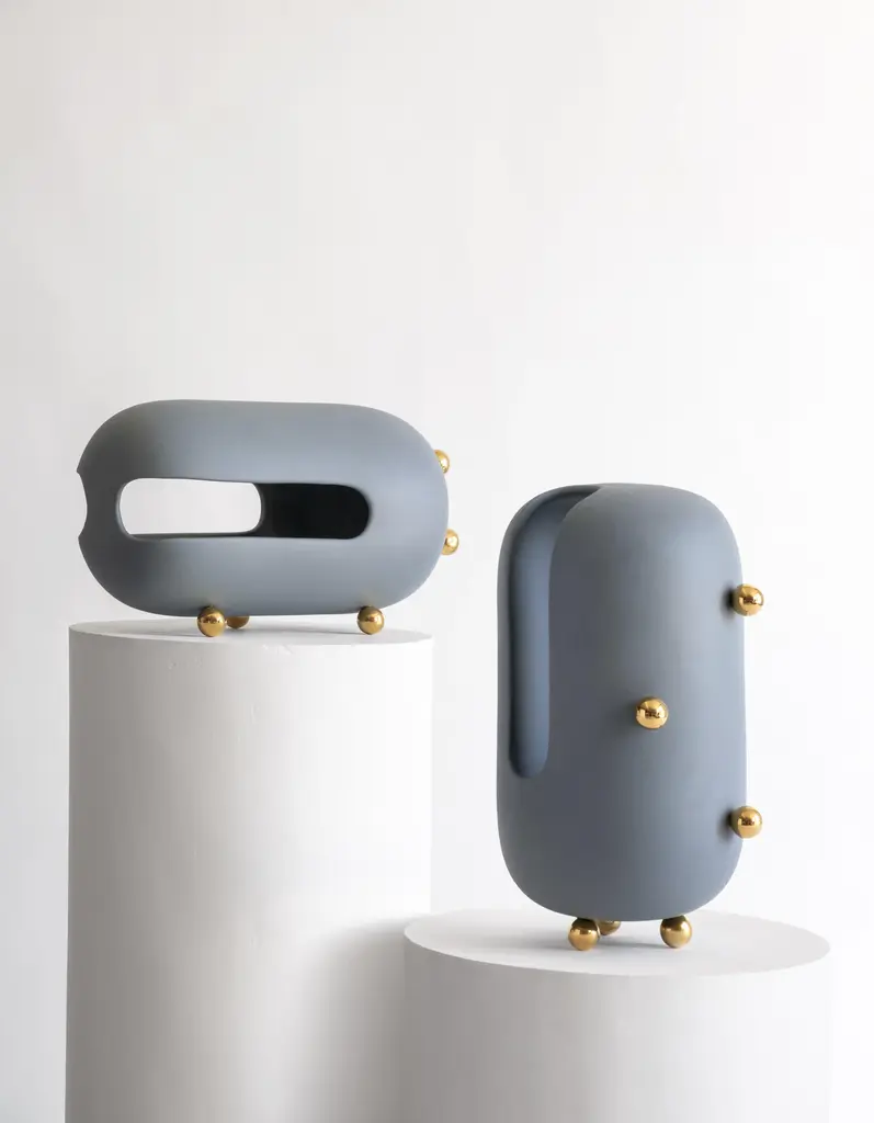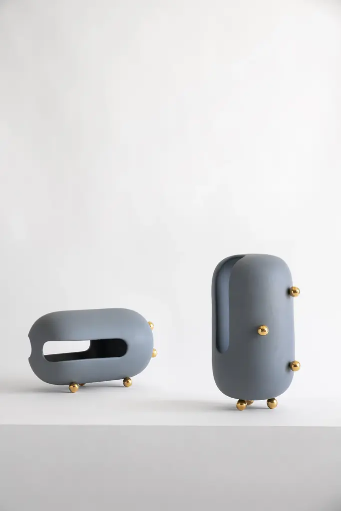 Anfore is a collection of biscuit -clay dyed- porcelain vases with opaque finishing, coming in three different colors. Golden spheres allow the vase to be placed both vertically or horizontally.