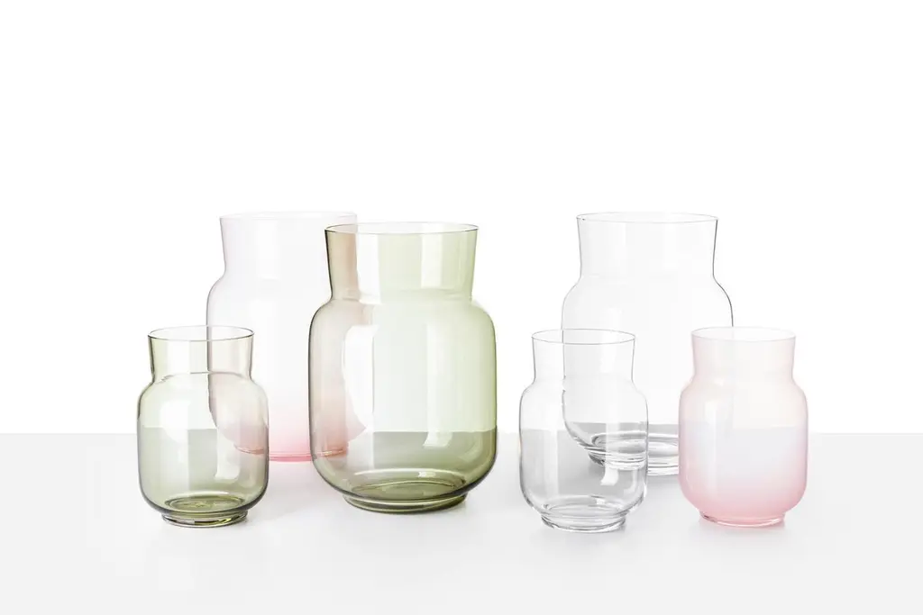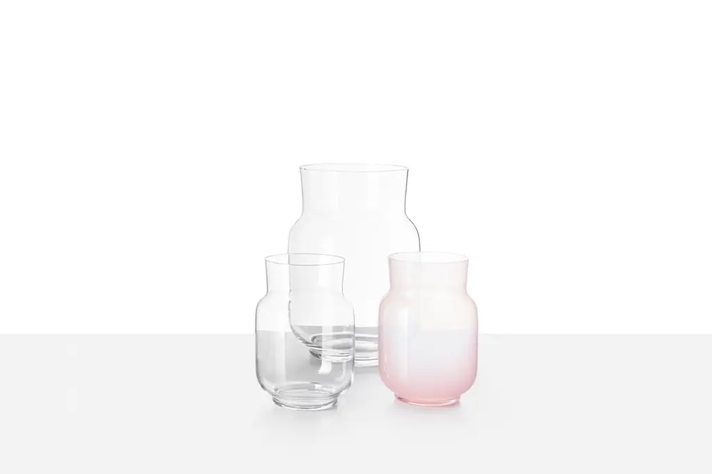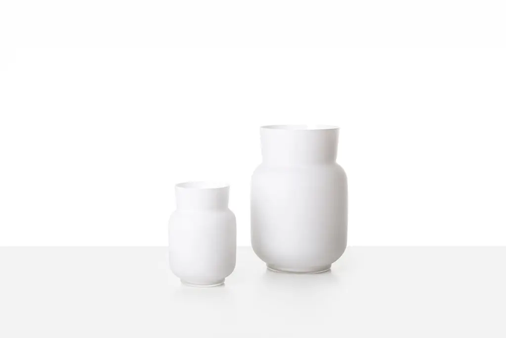 Small vase20 by Dechem Studio.Dimensions: D 14 x H 20 cm.Materials: glass.Available in 2 sizes: D 14 x W 20/ D 17.5 x H 25 cm.Available in white matte, crystal clear, pine green, powder pink, autumn red.Elegant lines and muted colour gradients are a characteristic signature of DECHEM studio. Vase 20 presents the reversed conical neck as a new feature and can be easily combined with the Vase 19 or Bandaska vases as well. hand blown into beechwood moulds, Vase 20 comes in two different sizes.We are DECHEM.We are Michaela and Jakub, designers and storytellers in Bohemian glass. Our work is based on contemporary design combined with a mastery of production and a healthy respect for old Central European Craft and traditions.We design, produce and sell our collections of lights and decorative glass products. We produce unique light fixtures made from a combination of mouth-blown glass and handcrafted brass. Our glamorous chandeliers light up any space with a playful yet elegant appearance.A significant component of our work is blowing glass into a colour gradient. The wide range of fresh gradient colours is a distinctive feature of the Bandaska vase from our collection. It draws inspiration from traditional milk containers, well-known in Czech village households, and their elegant lines are now coming into modern homes in the form of our glass vases and lights.In addition to our normal production, we love to devise bespoke luminous objects for interiors. They arise from experimenting with unconventional materials and unusual combinations.Along with our own work, we like to be part of special collaborations and exhibitions. We have collaborated with renowned galleries and institutions, and curated and exhibited projects in Milano, London, Frankfurt, Istanbul and several other cities around the world.All of our creations are manufactured with care in Czech workshops using unique methods, including hand-blowing, snapping, cutting, grinding, firing, engraving and glass painting.We founded DECHEM studio in Prague in 2012 as partners in both work and life after years of studying glass Craft and design, and we have grown it into a renowned and award-winning design studio.