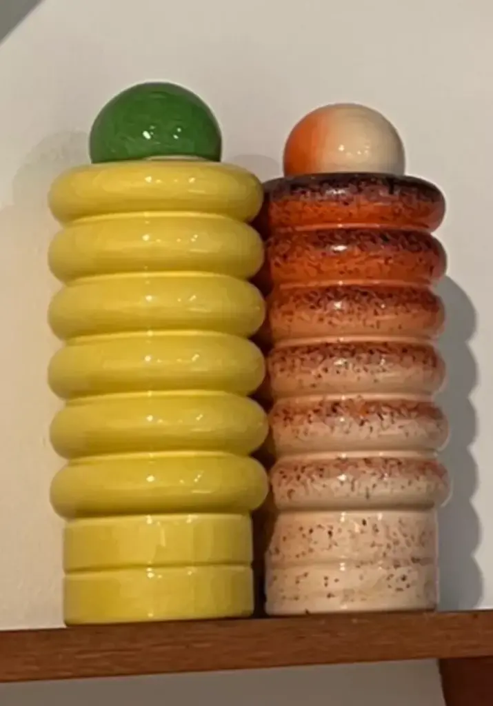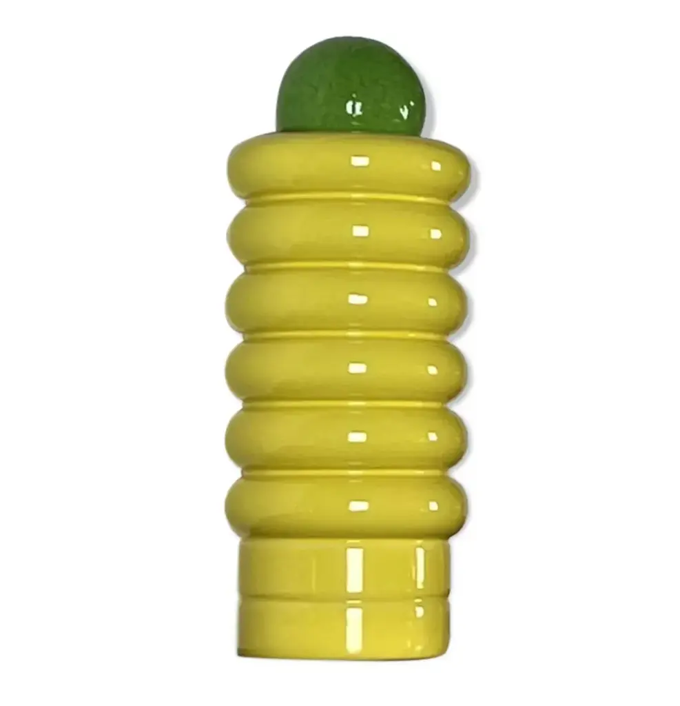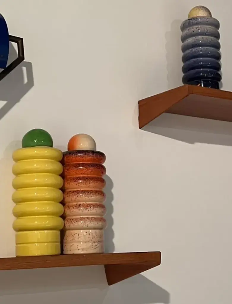 These vases were created by Polish ceramic artist Malwina Konopacka in 2021. They are part of the NANA series of vases based on a small cylindrical structure. They also have a spherical cap. These pieces are made of glazed ceramics in solid or gradient colors. 2 models have in addition of the painting speckled effect.