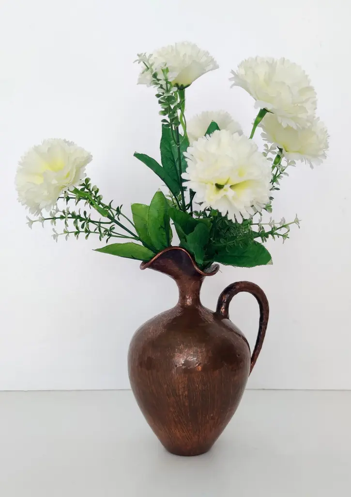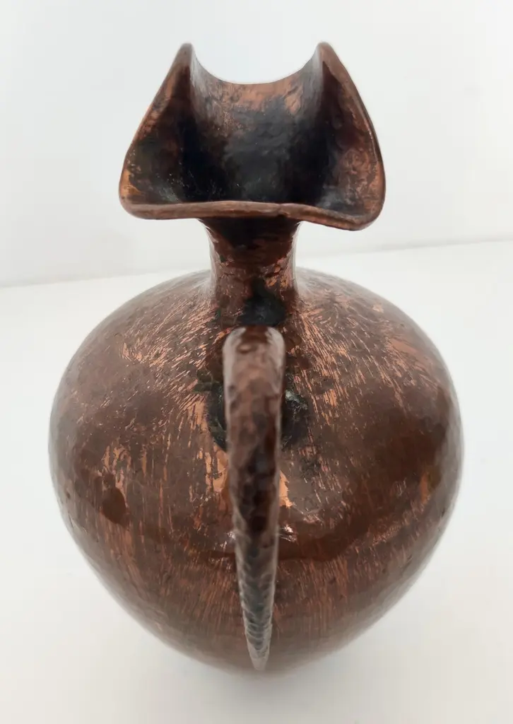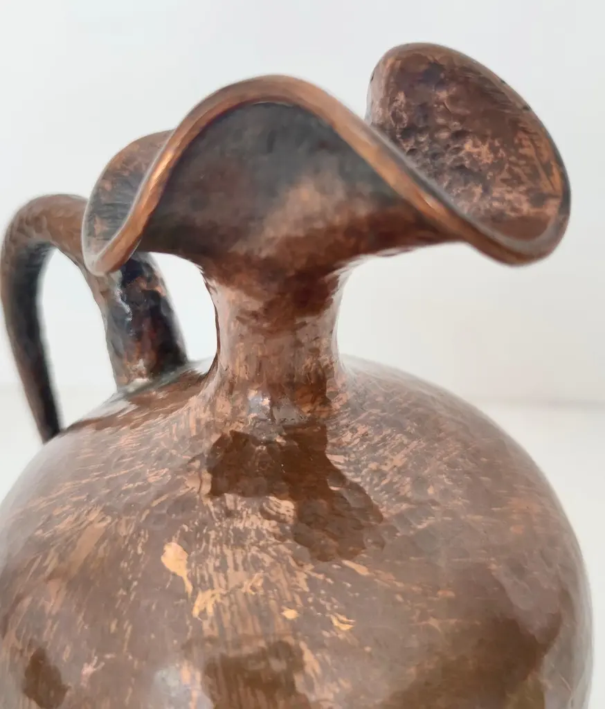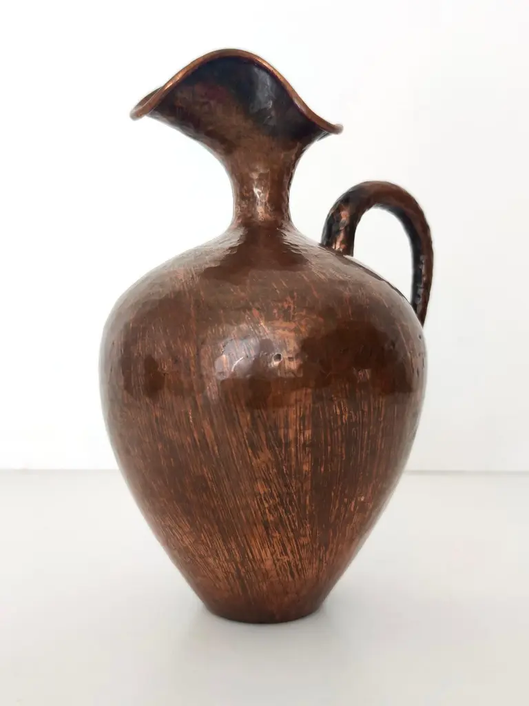 Made in Italy, 1950s.This pitcher vase is made in embossed copper. Its minimal and classical, but still modern. Its design perfectly embodies the spirit of the age. It is a vintage piece, therefore it might show slight traces of use, but it can be considered as in excellent original condition and ready to become a piece in a home. Measures: Diameter: 16 cm Height: 21 cm.Order it now!We sell the best quality pieces and we offer an amazing service: if it's not during night time, we answer within 2 hours and we absolutely love to follow every step of the purchase and even after. As matter of fact we really appreciate our customers’ feedback and when we receive pictures of our pieces in their new homes.We assist you during the process and answer all your questions. In addition to this, we always review the pieces before shipping, so that you receive the goods at its very best. We provide the best possible quotes and professionally and carefully pack the items. Insurance is included. And if there is any issue, it is our mission to make so you don't have to worry: we will always be there for you to assist in any way possible.