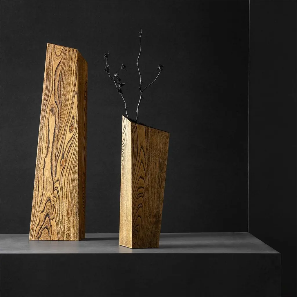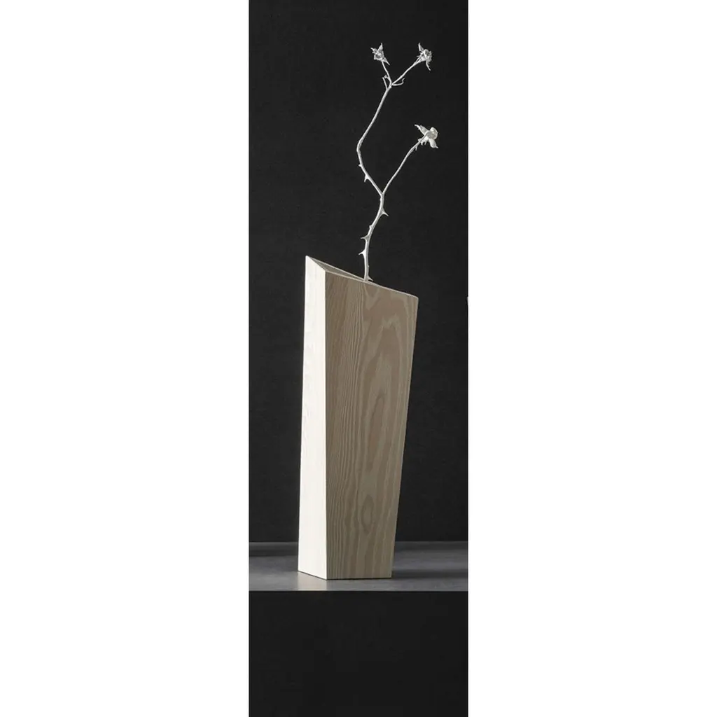 Large white ash nun vase by Matthias ScherzingerLimited Edition of 30 pieces, each colour each sizeEngraved brass-label with numberDimensions: L 14.5 x W 14.5 x 46 cmMaterials: ash: lyed - whiteLarge size available:L 19 x W 19 x H 73 cm NUN is a wooden vase which is handmade in a very elaborate way. Its base is built by a isosceles triangle growing into a spatial corpus.Although the simple setup – only 3 areas joint together by angles – NUN offers a set of new and interesting impressions from every point of view. Based on the dynamic interplay between shape, geometry and material, NUN becomes an art object full of facets and contrasts. At the same time it can be filled with water and used in the original and functional sense as a vase. This is made possible by the completely sealed inner surfaces.By the choice of wood and surface finish, the material is restaged in a different way. The highlighted wood structure appears like a graphic element and throws a new and fresh perception on the well-known material wood. The interaction of material and shape converts each vase into an art object.NUN is available in two sizes and colors and will be manufactured in a limited quantity of 30 pieces each.It all began in Glottertal, Germany. Born in 1978, Matthias developed early on a deep connection to nature and culture during his childhood. This was supported by the family‘s farming business (field, forest, vineyard, grassland). So, his rootedness in tradition and home arose early. Then, the handling of wood was restricted to the maintenance and care of the family forest.During school, Matthias’ strengths soon became visible. These all happened to be of the artistic kind. Driven by his practical nature, he was destined to start working in skilled crafts and trades after graduation. So in 1999, he decided to start an apprenticeship as a joiner/cabinet maker. Following his first professional years, he felt like a change. Following his inner voice in search of development and self-fulfillment, he initiated a journey in search of his new self.In 2014 he returned to his origins and founded his own furniture label by the name of FREUDWERK - Design & Manufaktur.Initially, FREUDWERK was merely a design studio located in Glottertal, Germany. In the meantime, Matthias owns and operates his own factory in Reute, Germany, where he develops and crafts his creations in a very skilled, careful and elaborate way. Alongside his own collection, Matthias manufactures designs from individual customer specifications. FREUDWERK services deliver conceptualisation, prototyping and serial manufacturing, that is, a wholistic design from beginning to end.