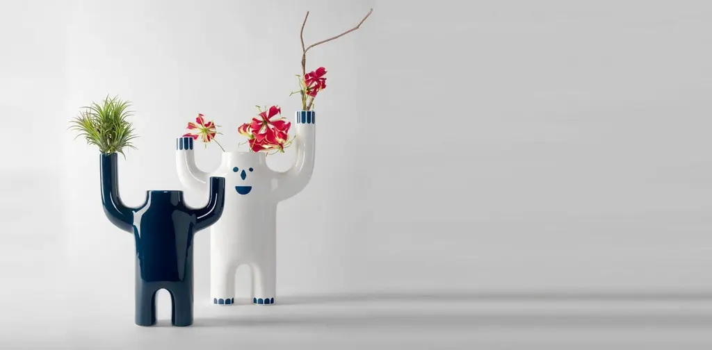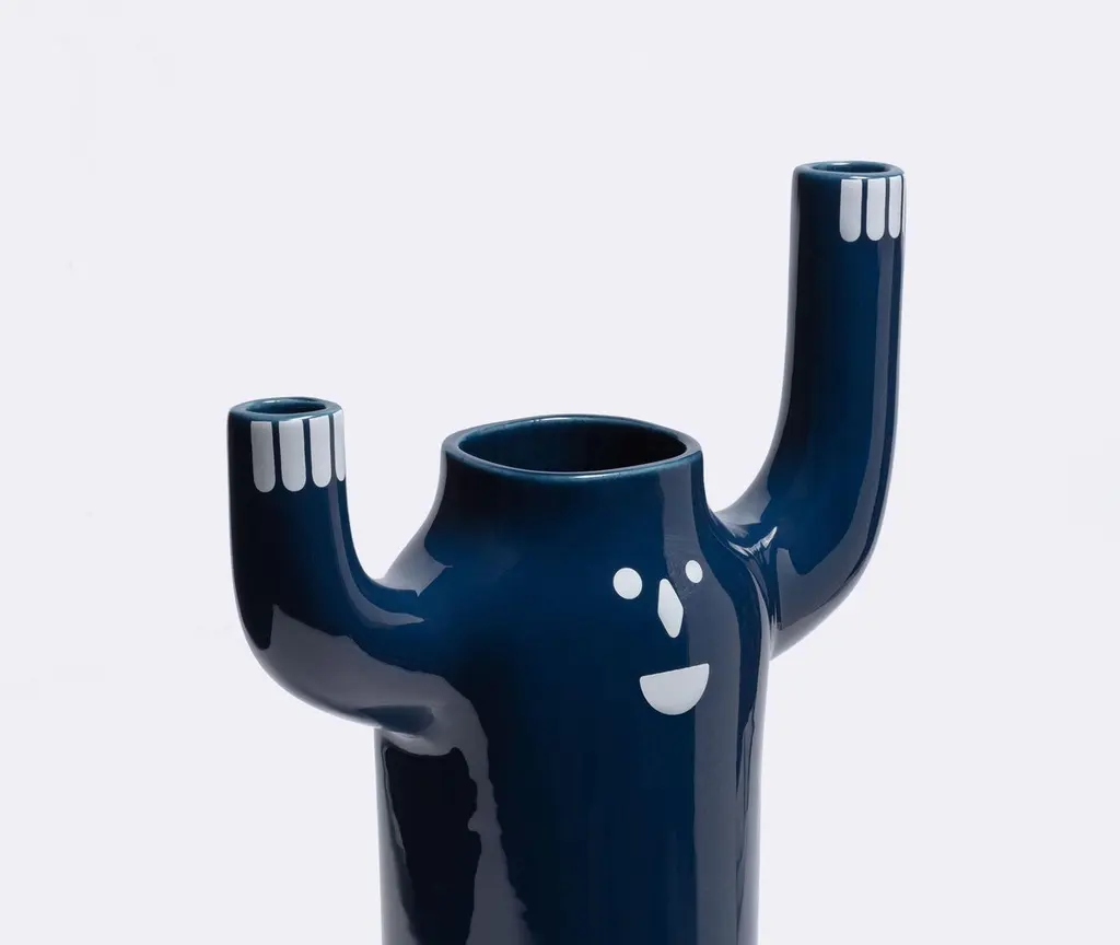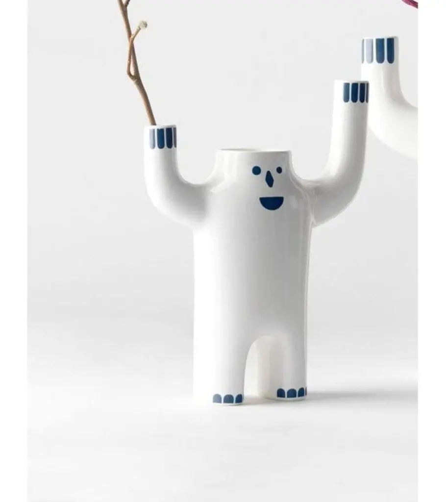 Small white happy susto vase by Jaime Hayon Dimensions: D 10 x W 24 x H 34 cm Materials: Glazed ceramic vase(s) in white or blue with decorations in white or blue.Also available in size large and in color blue.Little architectural pieces are what the master called them, which have naturally paralleled larger furniture items but are no less important due to their size. Among them is the humble water bottle designed by Josep M. Jujol, the imperfect vases by Xavier Mañosa, or the more iconic Showtime series by Jaime Hayon. An abundance of talent can be found in them, just the same as can be found in the pieces supporting them such as a cabinet. Their purpose is a decorative one, although, for us, they carry an emotional and artistic value. They are timeless and with the passing of time, we continue to add designs to a collection that continues to grow in importance within the range we have on offer. Several months ago we presented our chandelier REmix collection by Curro Claret, and now we inaugurate a ceramic collection that carries Jaime Hayon’s unmistakable character and humour. It’s called Happy Susto (fright in English) and is made in a couple of sizes, colors, and finishes. Little decorative items have been part of BD’s catalog since Ettore Sottsass drafted the Shiva vase back in 1973In 1972, a group of young architects and designers from Barcelona created BD with the aim of producing and marketing furniture and other objects for our projects, with complete creative freedom and with a criterion that has turned out to be quite different from the norm at companies in the sector, regarding both the shape and function.