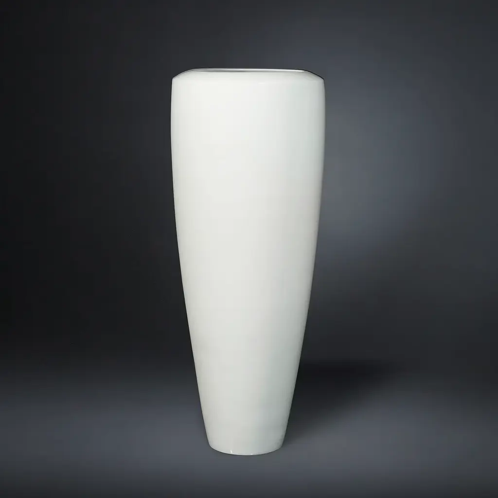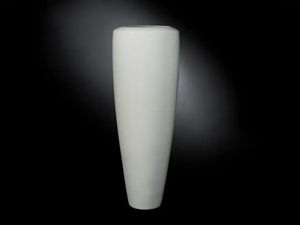 A statement decorative piece for a modern foyer or living room, this tall ceramic vase is distinguished for its streamlined silhouette recalling the artillery firearm that gives the collection its name. Available in several finishes, this version boasts a bright white, smooth surface and a large mouth suitable for arranging tall branches and cascading fronds.