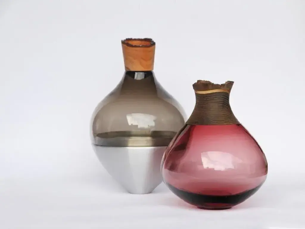 Small wine red pisara stacking vessel, Pia Wüstenberg Dimensions: D 23 x H 30 Materials: glass, wood. Available in other colors. Pisara, 'drop' in Finnish, is a Vessel striking by its simplicity and exclusive palette of pastel and vivid colours. The heavy drop shaped glass is perfect to use as a vase, as the smoked wooden acacia container can be removed and used to hold treats and utensils. Handmade in Europe: handblown glass (Czech Republic), smoked wood (Germany). The materials then come to our warehouse in North Germany where they are fitted and assembled. This piece is attributed to the mentioned designer/maker. It has no attribution mark and no official proof of authenticity, however it is well documented in design history. I take full responsibility for any authenticity issues arising from misattribution