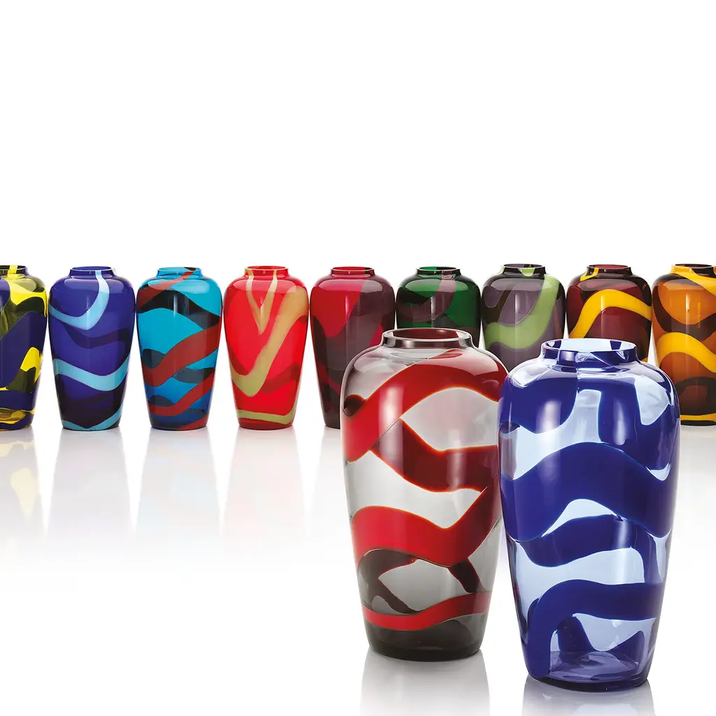 Part of the Snake Collection, this exclusive vase will enrich any decor with its luxe allure. The amphora-shaped silhouette made of Murano glass is accented in a delicate light-blue hue and boasts a snake-like decoration in a vibrant blue that seemingly coils up to the large mouth. This magnificent object of functional decor is also available in different sizes and colors to best suit multiple chromatic palettes, please contact the Concierge for details.