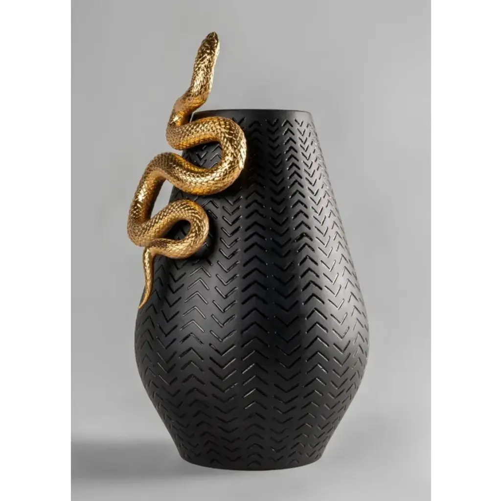 Black porcelain vase decorated with a snake in golden luster. An iconic Spanish brand, Lladro is a world leader in the creation of porcelain art. Started by brothers Juan, Jose and Vicente Lladro in 1953, the ceramic figurines were initially inspired by the works of great European manufacturers like Meissen and Sevres. Over time, a unique style was forged, consisting of elongated lines, a revolutionary single-firing method, and soft pastel tones.