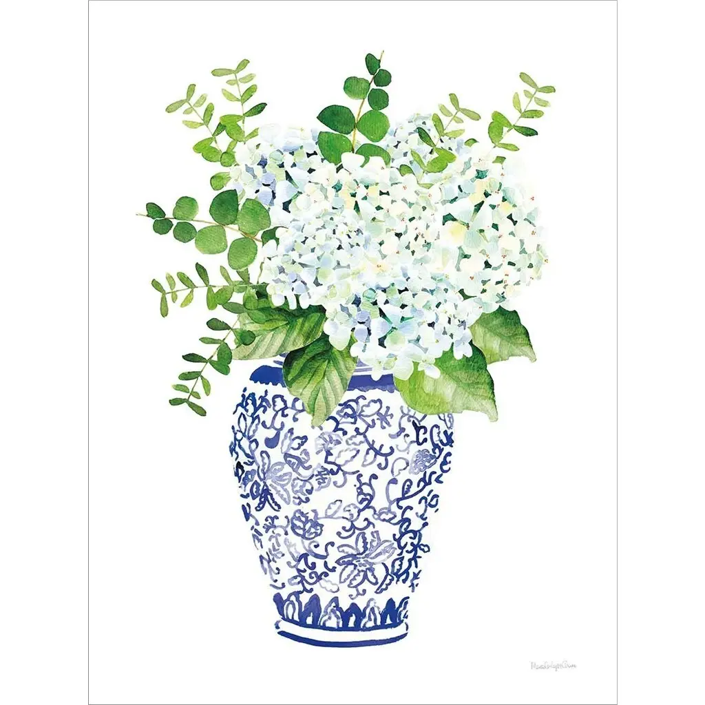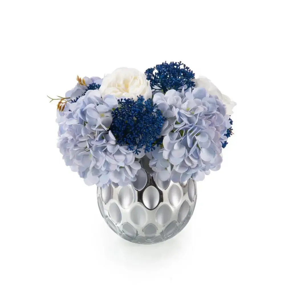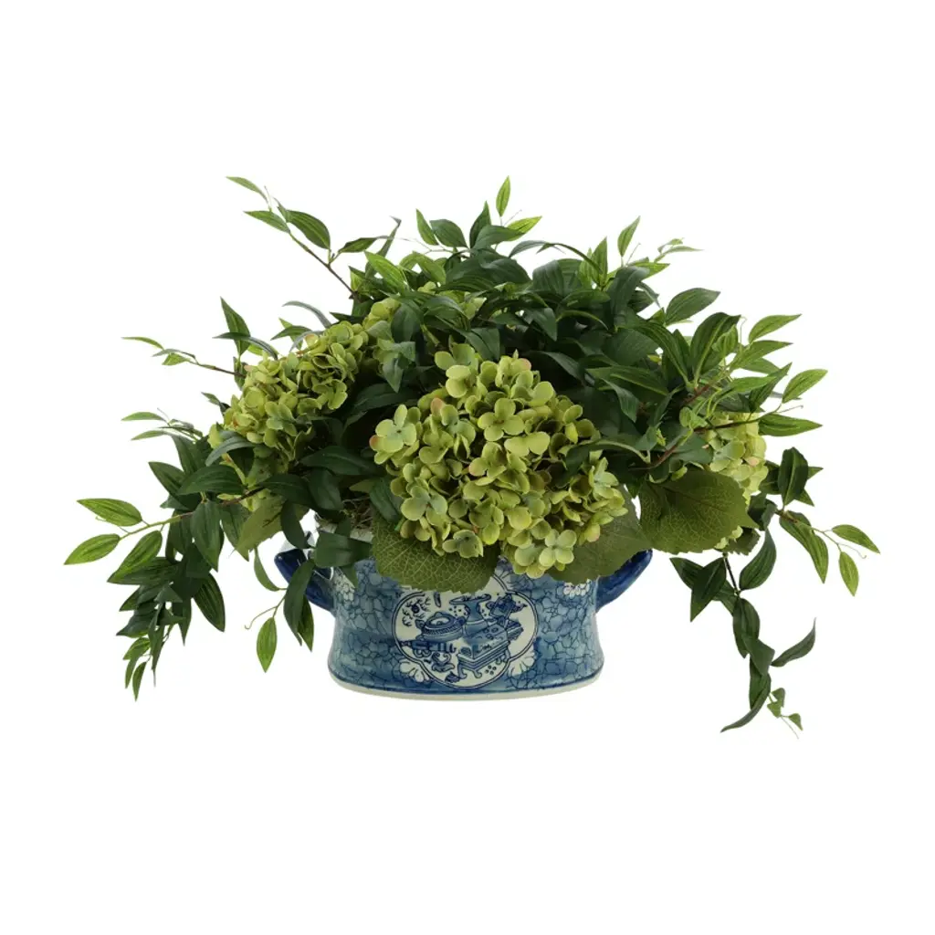 Designed to look lush and lifelike all year long, this handcrafted faux hydrangea arrangement is beautifully presented in a blue-and-white ceramic vase.