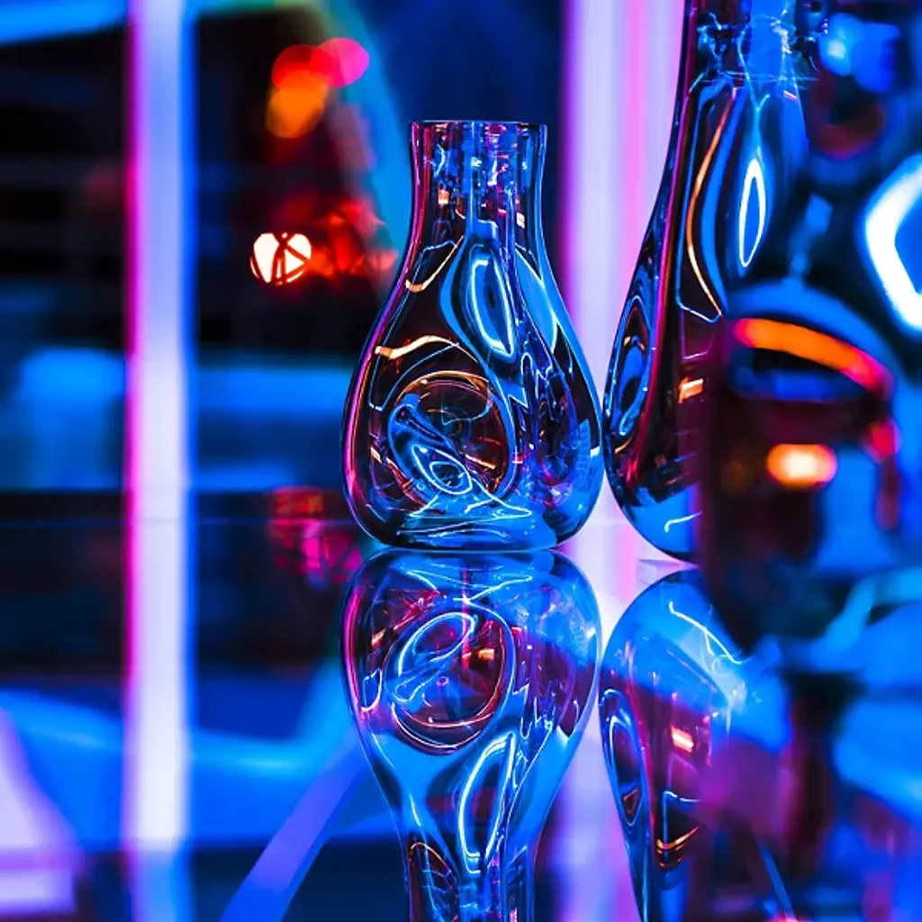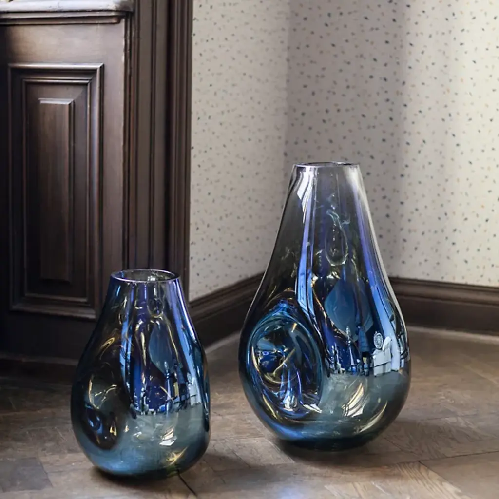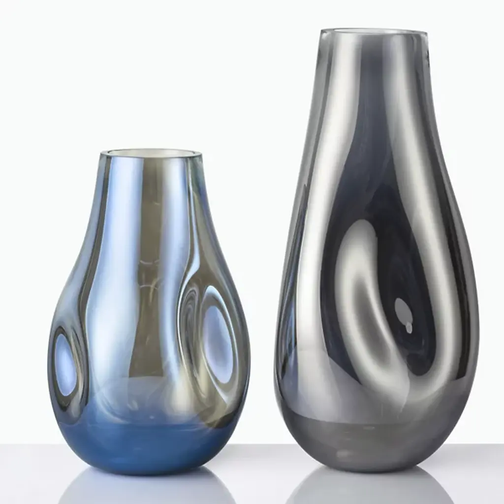 The Soap Vase from Bomma captures the iridescent, shifting qualities of soap bubbles in hand-blown crystal. Designed by Boris Klimek, each piece is created without a mold, allowing the glass to form organically as the glassmaker works. This free-form approach means that every vase develops unique proportions and surface characteristics, differing from piece to piece. The metallic sheen across the crystal shifts between translucent and iridescent depending on lighting conditions and viewing angle. These color transitions reference the thin-film interference that creates rainbow effects on actual soap bubbles.