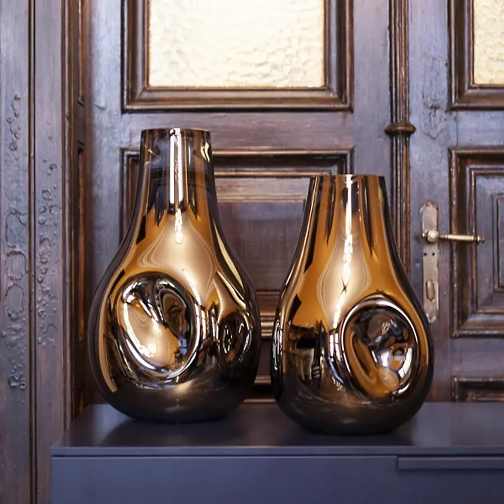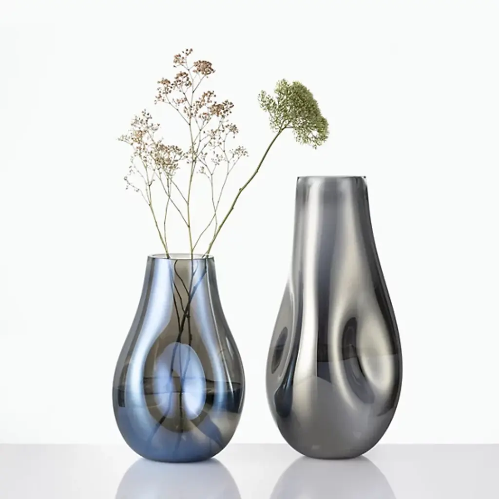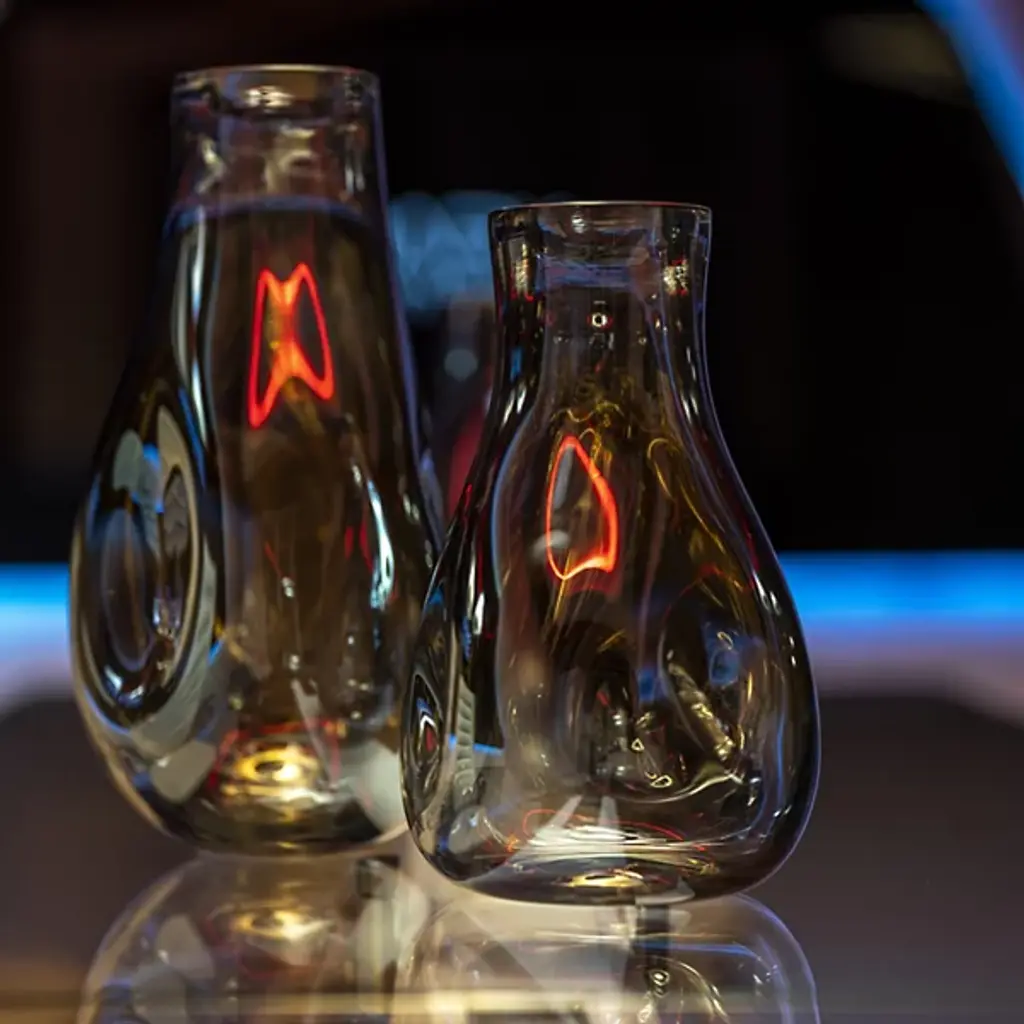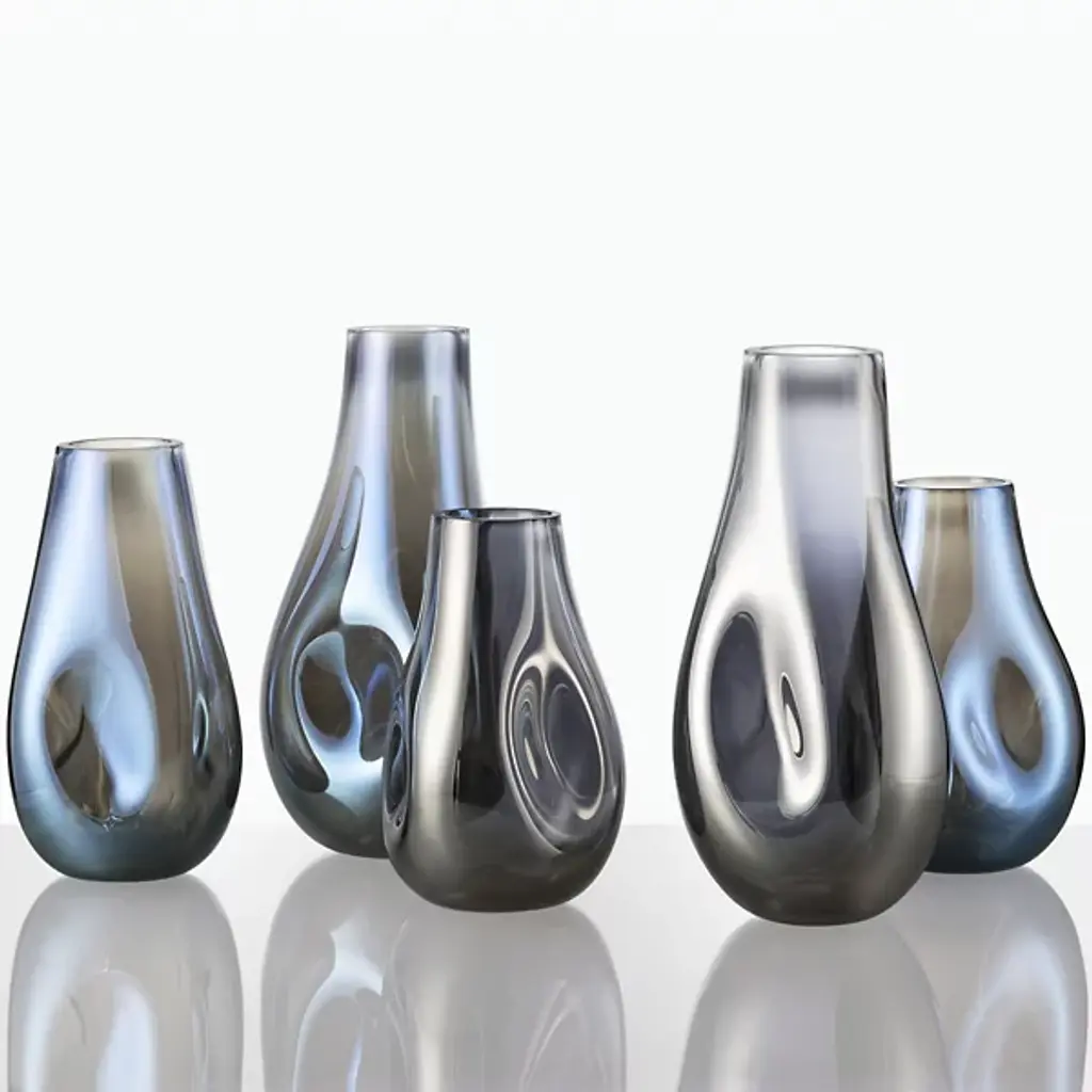 The Soap Vase from Bomma captures the iridescent, shifting qualities of soap bubbles in hand-blown crystal. Designed by Boris Klimek, each piece is created without a mold, allowing the glass to form organically as the glassmaker works. This free-form approach means that every vase develops unique proportions and surface characteristics, differing from piece to piece. The metallic sheen across the crystal shifts between translucent and iridescent depending on lighting conditions and viewing angle. These color transitions reference the thin-film interference that creates rainbow effects on actual soap bubbles.