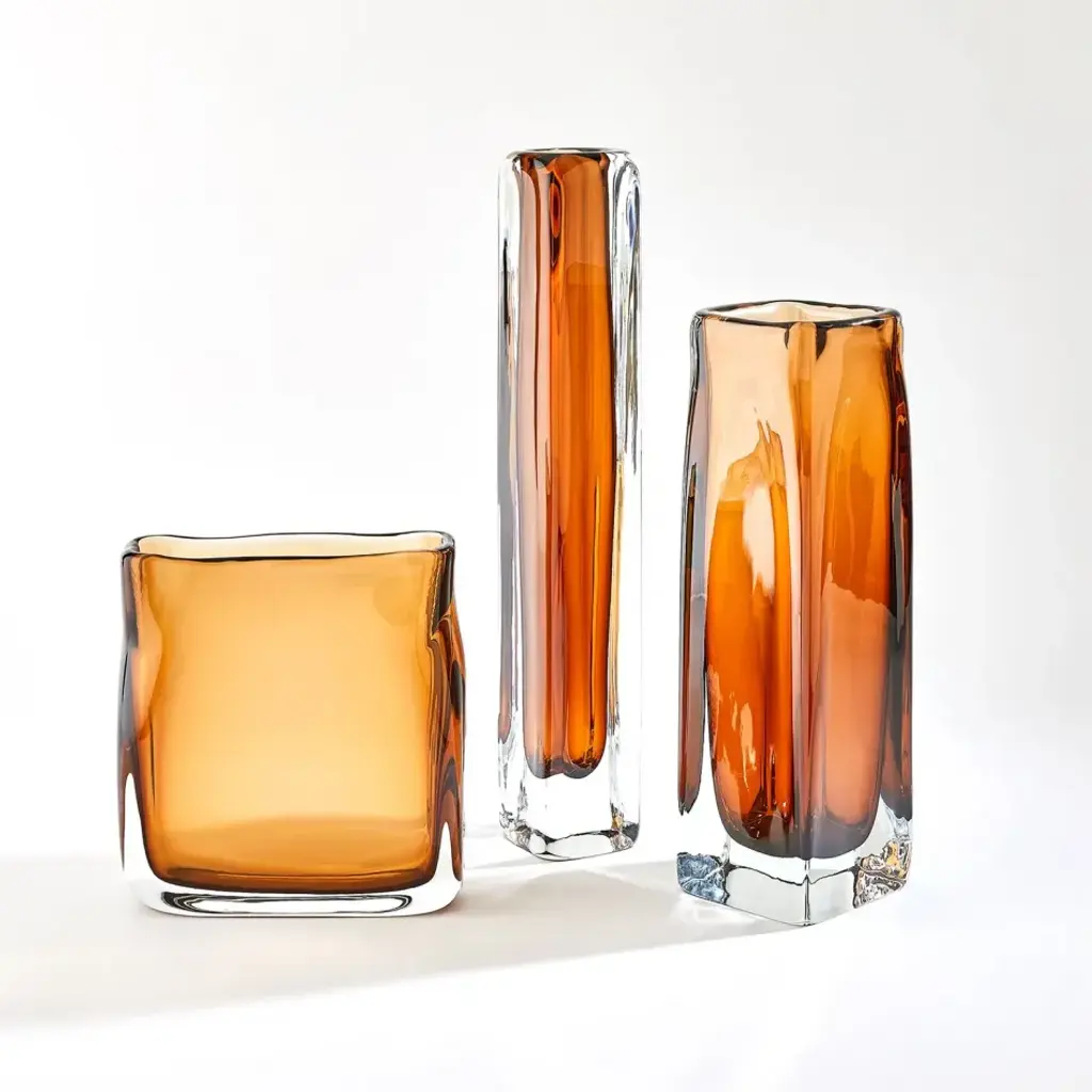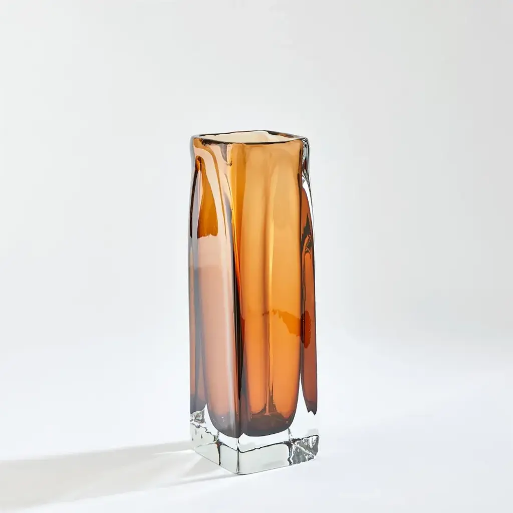 Crafted by Polish artisans, the Square Tower Vases and Soft Rectangle Vase achieve their encased color through a hand-blowing technique in which clear and amber-colored glass are layered together to create a distinctive visual effect. Each piece is unique and one-of-a-kind. From a fashion forward perspective, Global Views offers accessories, furniture, statement lighting, and an assortment of rugs and mirrors to add beauty and joy to your home.