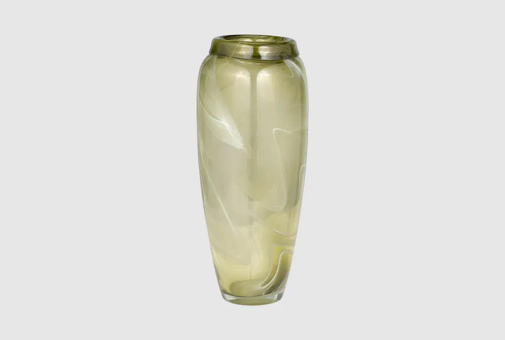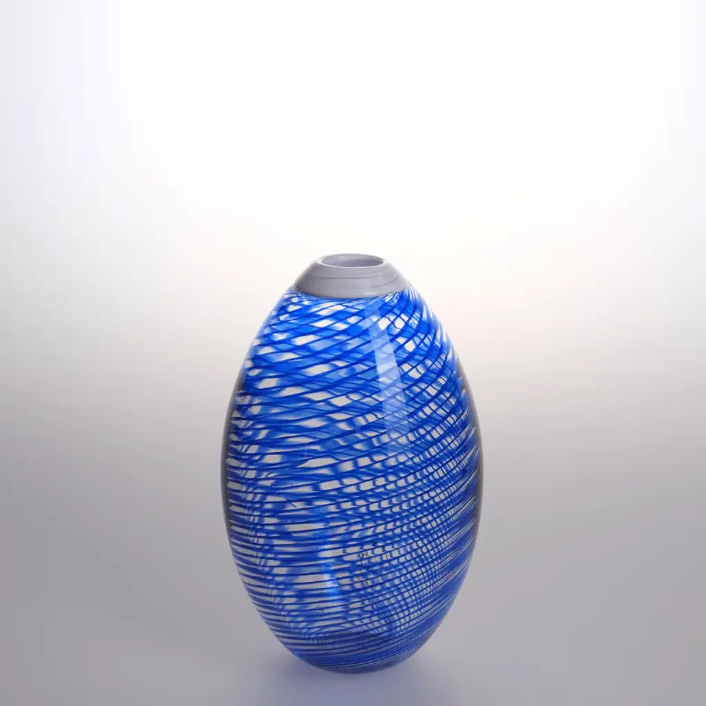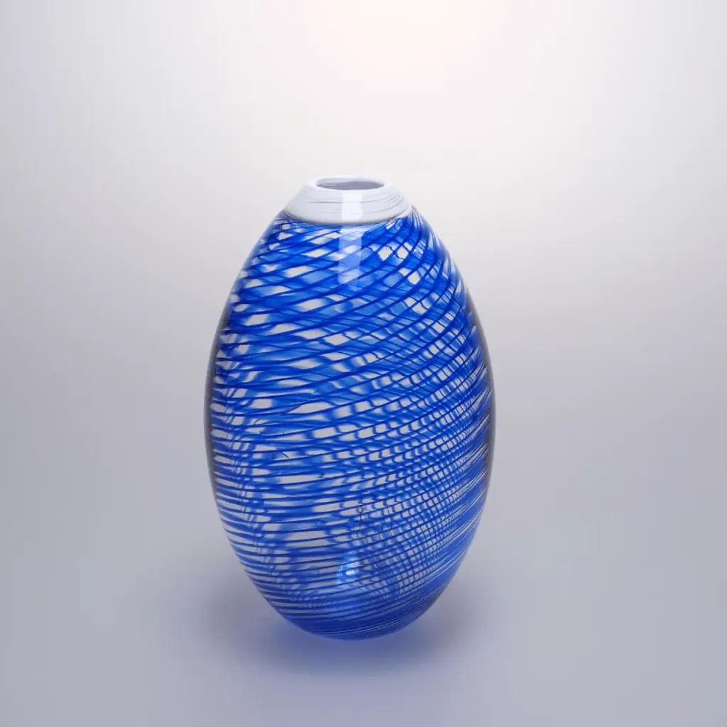 Translating to “Blue Dreams,” the Sogni Azzurri Vase embodies the poetic grace of Italian glassmaking with its delicate merletto—lace—pattern swirling through deep azure and clear glass. Its softly rounded, egg-like form evokes a sense of serenity and harmony, while the intricate white threads encased within the glass mimic the lightness of lace suspended in water. A true expression of craftsmanship and elegance, this vase is ideal for minimal floral arrangements or as a sculptural accent piece. Each creation is hand-blown by skilled artisans, making every vase a singular celebration of timeless design and contemporary artistry.