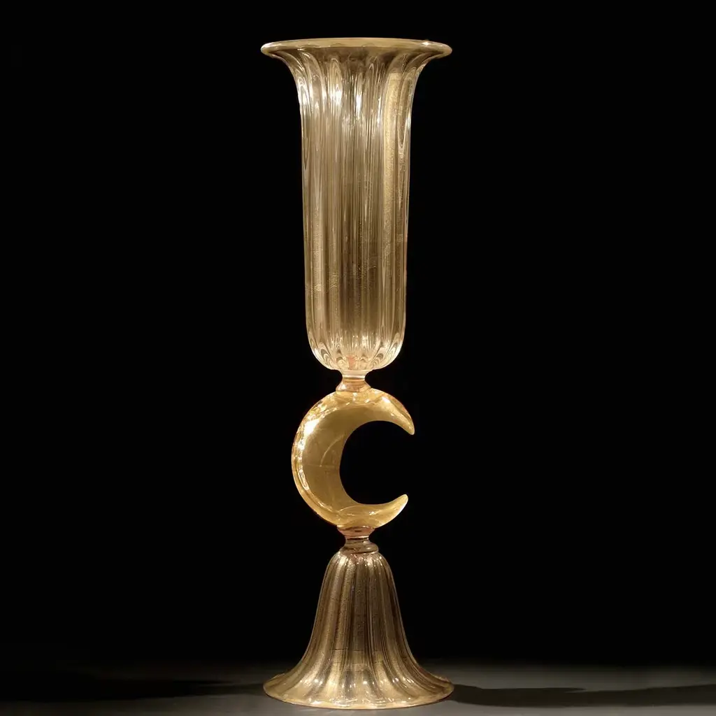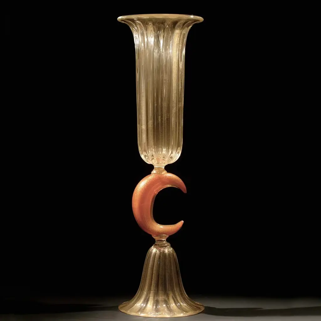 Unique and bold, this extraordinary vase bears the distinctive creativity and high craftsmanship that distinguishes Fornace Mian products. This eccentric vase is fashioned of clear and gold Murano glass and is distinguished for the intricate moon that connects the body and base of the vase, acting as the structural and aesthetic focal point of the piece. The vase's fluted surface texture elongate the slender shape of the bell-shaped mouth and footed base. The flecks of gold shine through in the light, casting intense reflections in any decor.