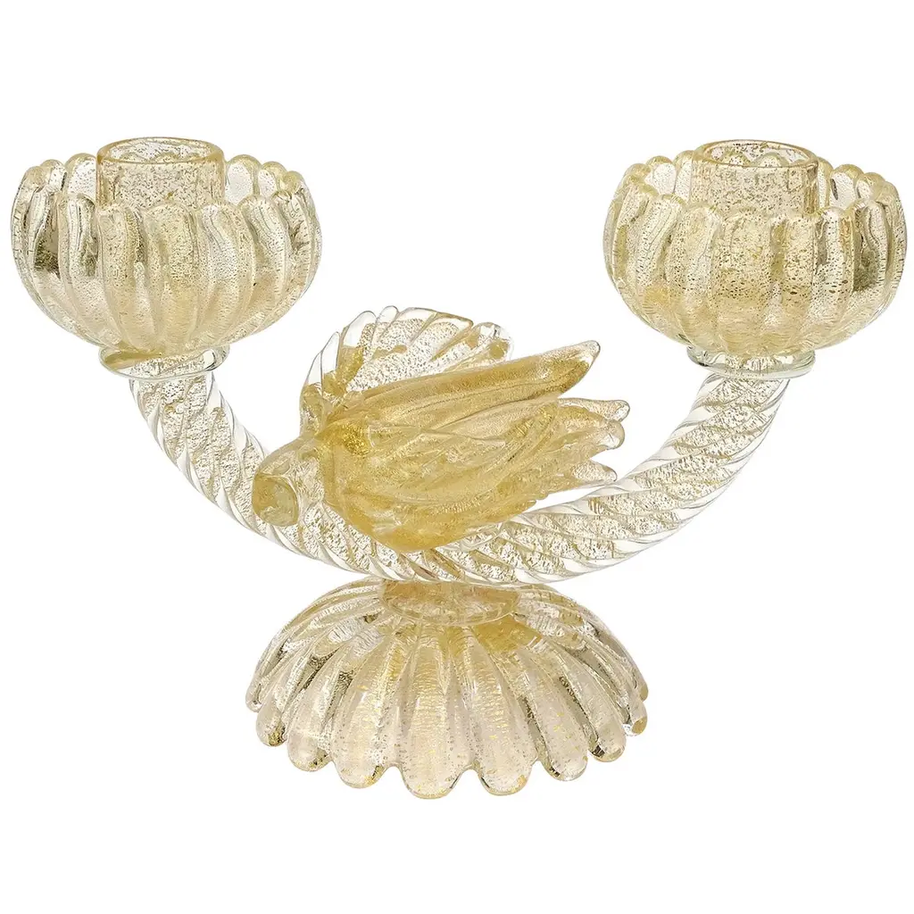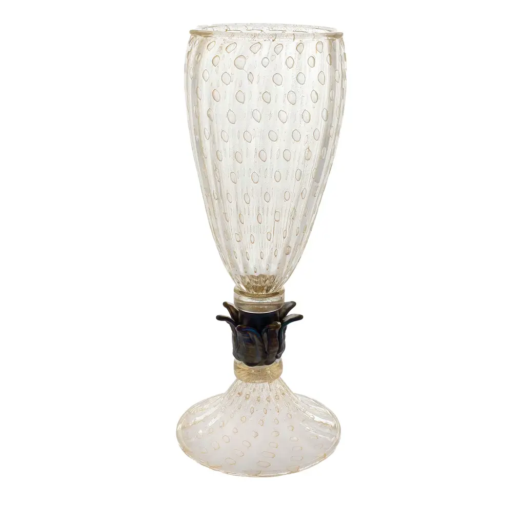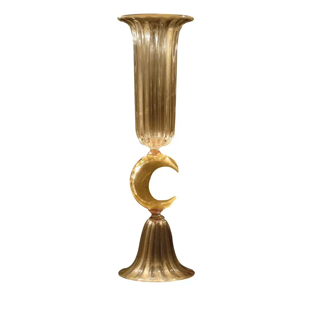On a console, table or mantle, the brilliant shimmer of this lavish glass vase set will make a striking impact in a traditional or modern interior decor. Crafted of crystal and gold Murano glass, the tall silhouettes have straight sides that slightly taper to form a bell-shaped mouth, the fluted surface texture elongating its slender shape. Each vase features an ornate moon or sun that not only connect the vase with the base but create a focal point that enhances the piece's dramatic allure. This piece is ideal for displaying with long-stem flowers for an elegant touch.