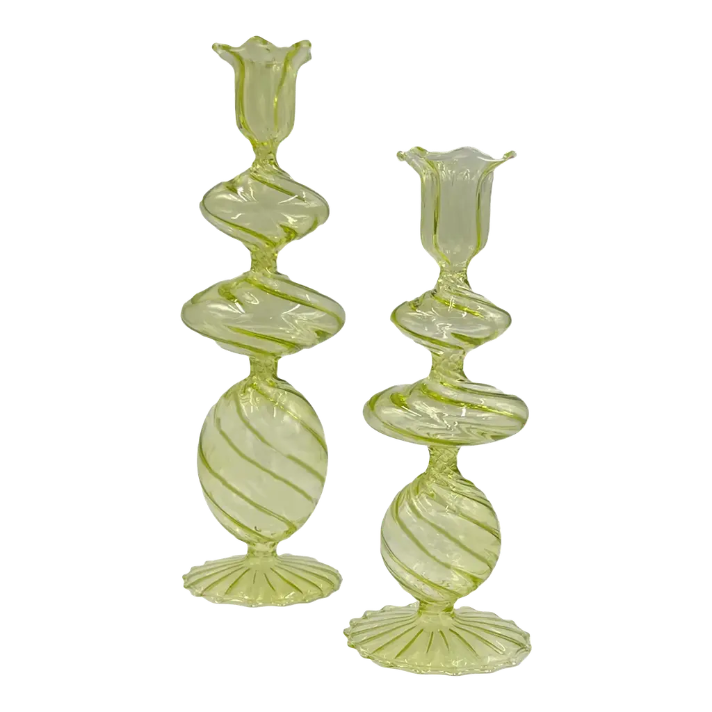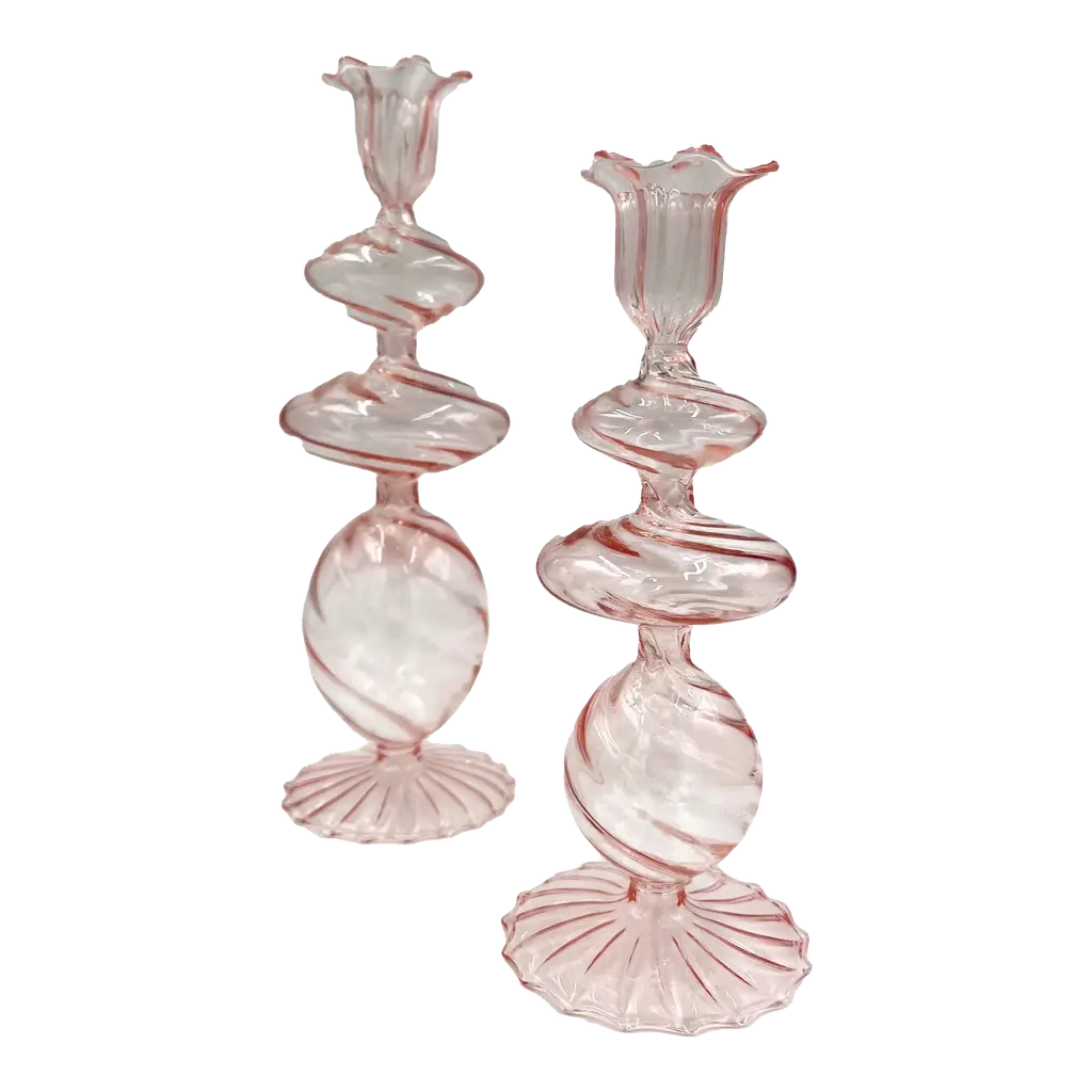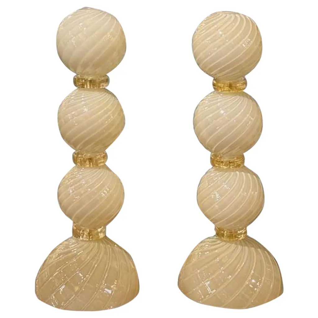 On a console, table or mantle, the brilliant shimmer of this lavish glass vase set will make a striking impact in a traditional or modern interior decor. Crafted of crystal and gold Murano glass, the tall silhouettes have straight sides that slightly taper to form a bell-shaped mouth, the fluted surface texture elongating its slender shape. Each vase features an ornate moon or sun that not only connect the vase with the base but create a focal point that enhances the piece's dramatic allure. This piece is ideal for displaying with long-stem flowers for an elegant touch.