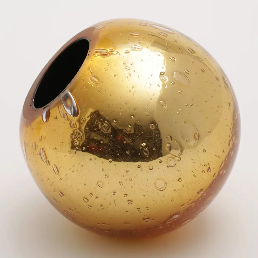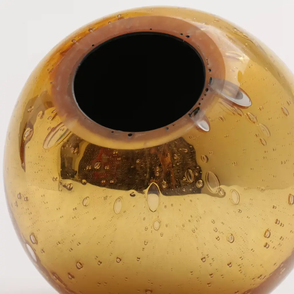 This exquisite amber-colored vase has a distinctive pattern of bubbles on its surface (a texture called "Pulegoso"). A cold mirror finish creates the striking effect of glossy gold.
