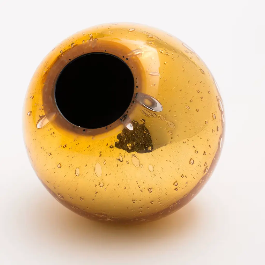 This exquisite amber-colored vase has a distinctive pattern of bubbles on its surface (a texture called "Pulegoso"). A cold mirror finish creates the striking effect of glossy gold.
