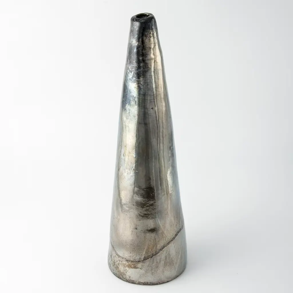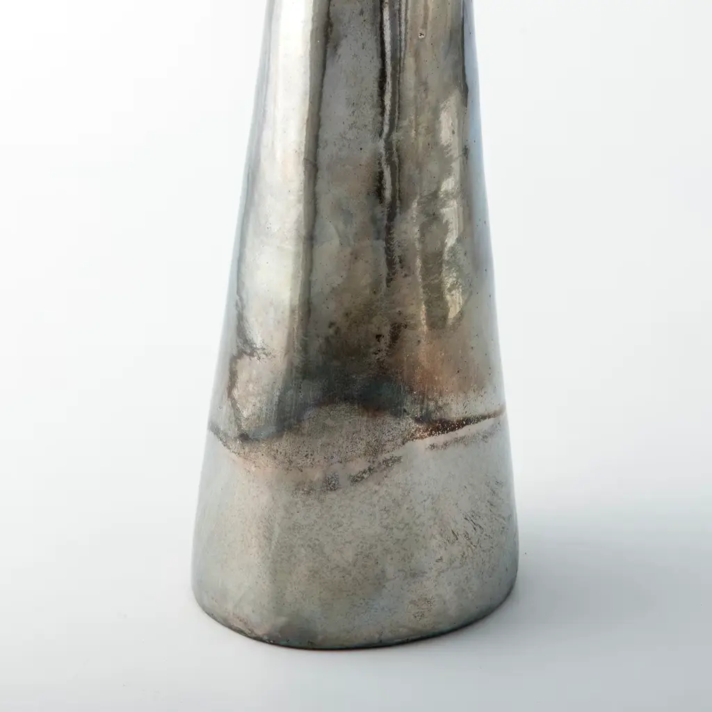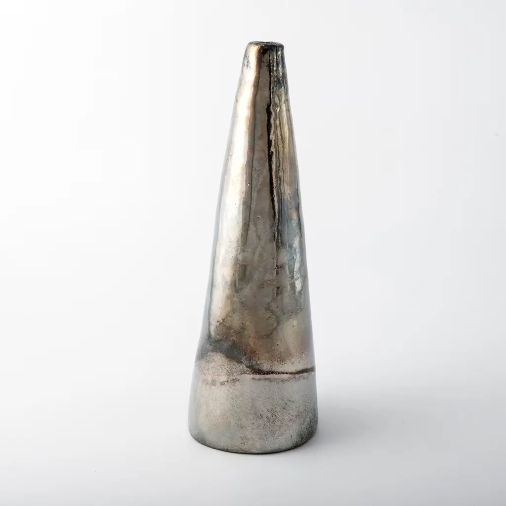 Cobalt-blue, black, and gray brushstrokes enriched with silvery reflections actualize the poetic image of a nocturnal sky that this conical ceramic vase was named after. A singular piece by artist Nino Basso crafted and decorated by hand reinterpreting the Japanese Raku technique, it enchants with its triumph of iridescent finishes that each time flaunt a different tone at the variation of light exposure. Authenticity certificate and care instructions are included with purchase.