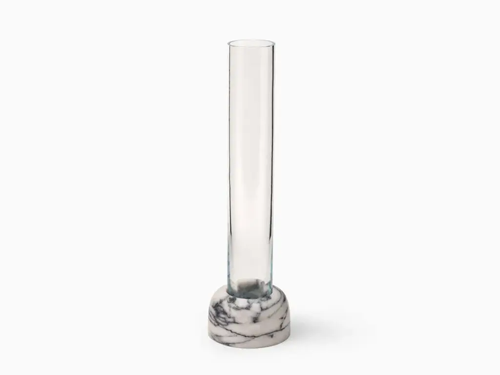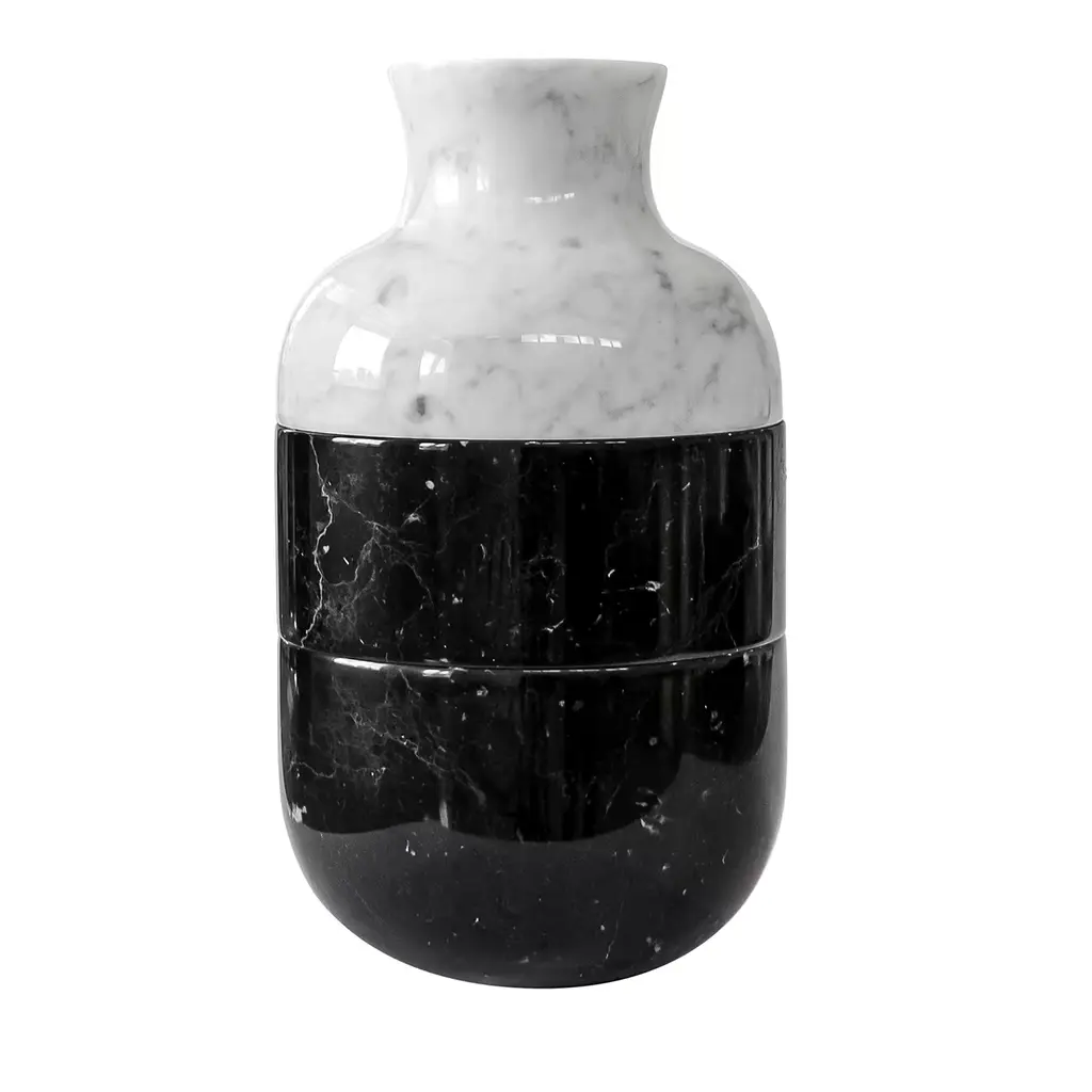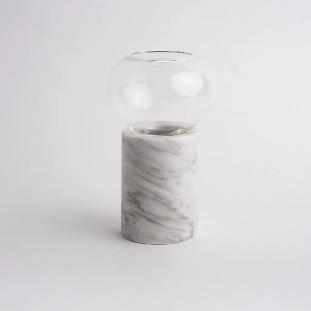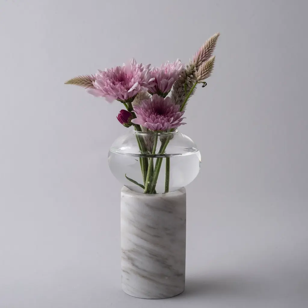 The base of the vase is hand carved in marble of different colors: black, white, pink, volcanic stone, etc. in which borosilicate glass is introduced. This glass is shaped like a beautiful original bubble.