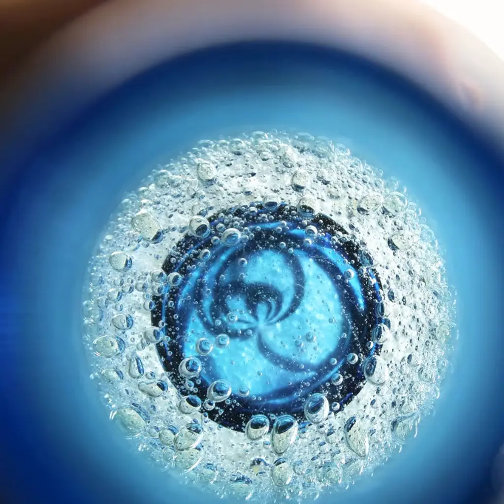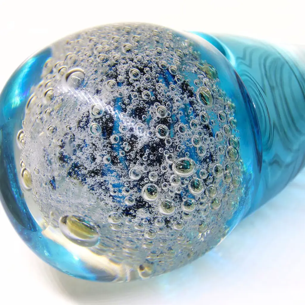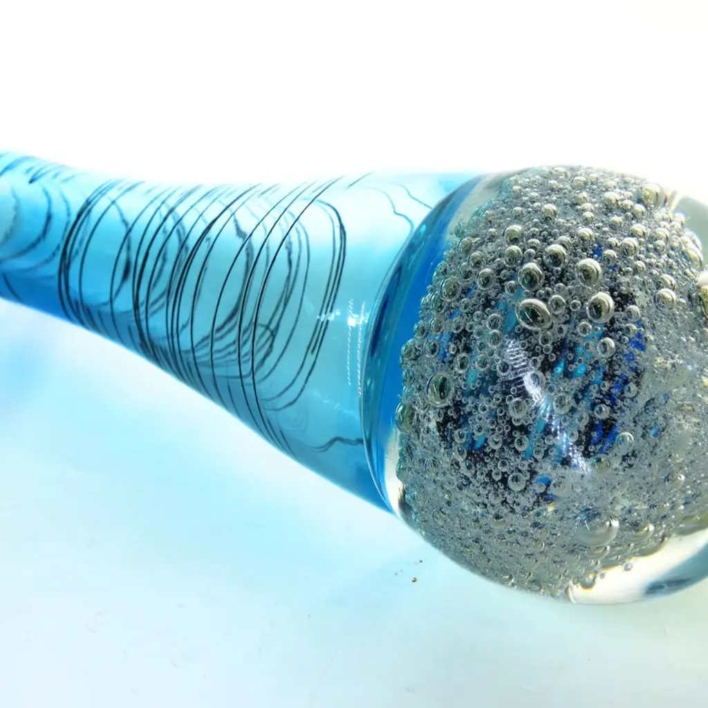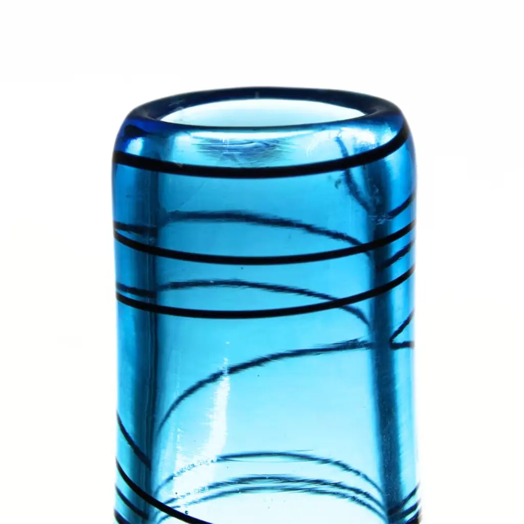 The Sommersione Interiore vase is a masterpiece of Venetian craftsmanship, created using the rare incalmo technique that seamlessly blends layers of glass. Its base features the unique "sommersione interiore" method, with submerged bubbles and swirling black and blue tones that evoke the ocean's depths. Delicate black glass threads add a refined touch, making this vase a stunning example of Murano artistry and design.
