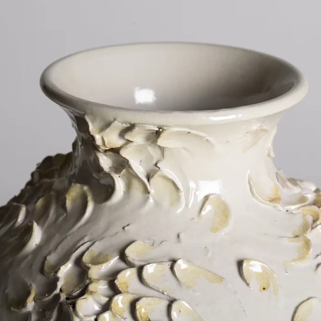 Exquisite detail in the form of chrysanthemum petals spiral around the body of this elegant maiolica vase. Entirely handcrafted employing the traditional maiolica ceramic techniques by the artisans of the Tuscan atelier ND Dolfi.
