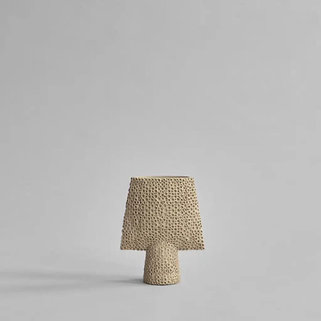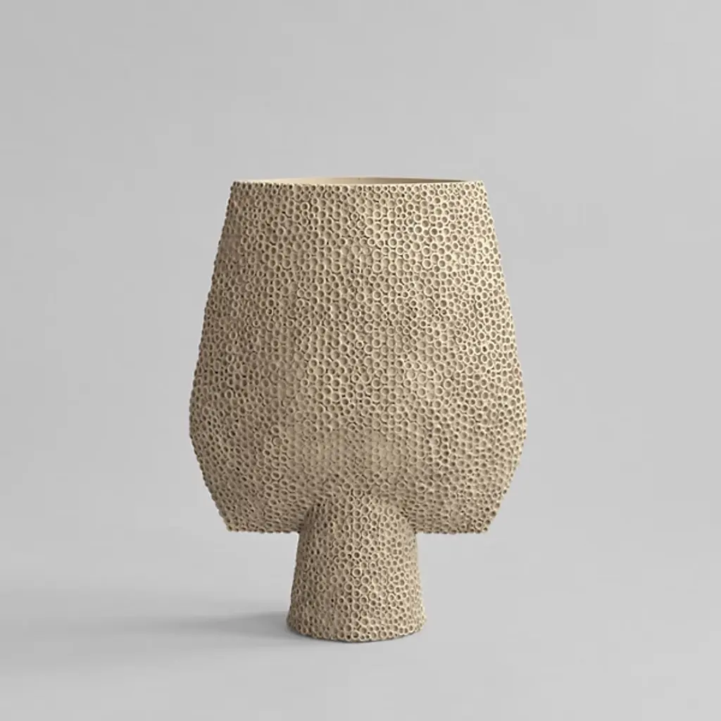 The Sphere Square Vase from 101 Copenhagen is celebrated for its sculptural elegance and unique design, inspired by ancient Chinese vases. Crafted with smooth shapes and sharp edges in a palette of faded earth tones, each hand-glazed vase showcases intricate detailing. Slight color variations add to its natural charm. While not fully waterproof, a bag for fresh flowers is included.