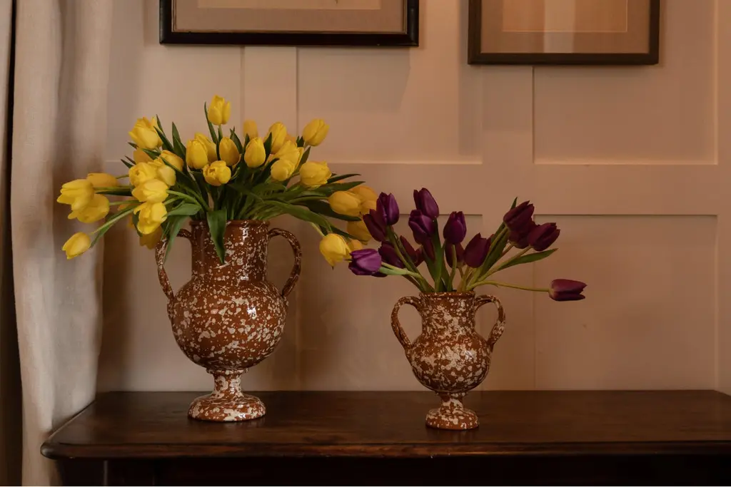 A standout centrepiece, the Verona vase is handmade in Italy. Our design comes in four colourways: Pink & Blue, Tan & Ivory, Yellow & Verde and Terracotta & Cream.
