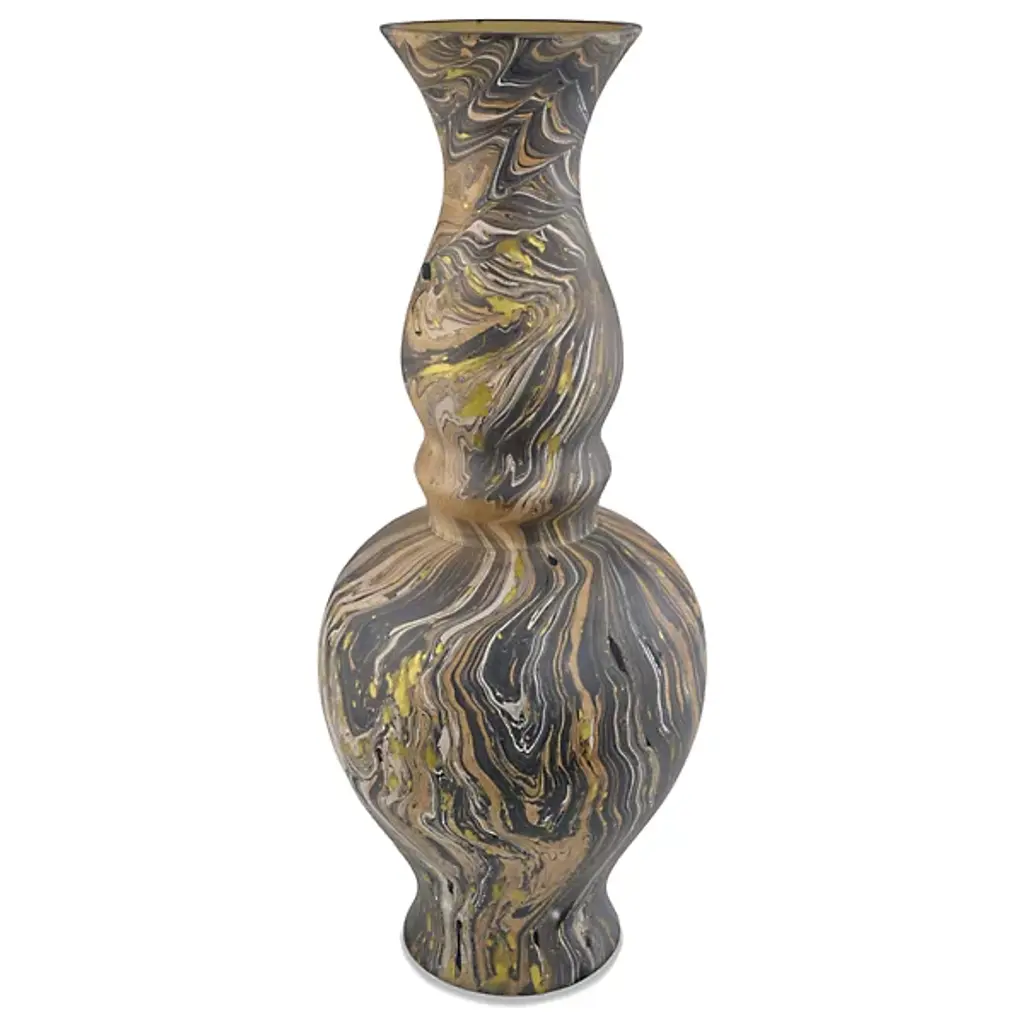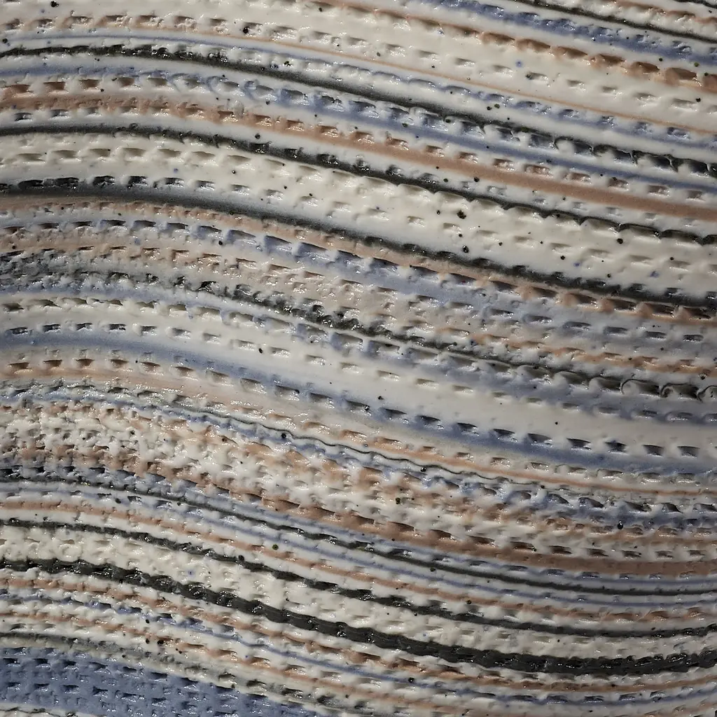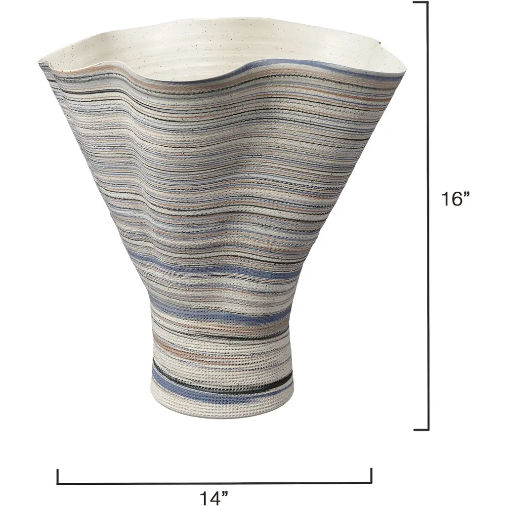 Horizontal stripes in cloud white, soft sand, and sky blue are hand-painted onto the graceful curves of this gently textured porcelain vessel. The palette is inspired by the serene beauty of desert landscapes. The result is a casually elegant accent that feels perfectly at home in any warm and welcoming interior. It is lovely enough to display on its own, yet versatile enough to use with your favorite fresh or faux fillers.