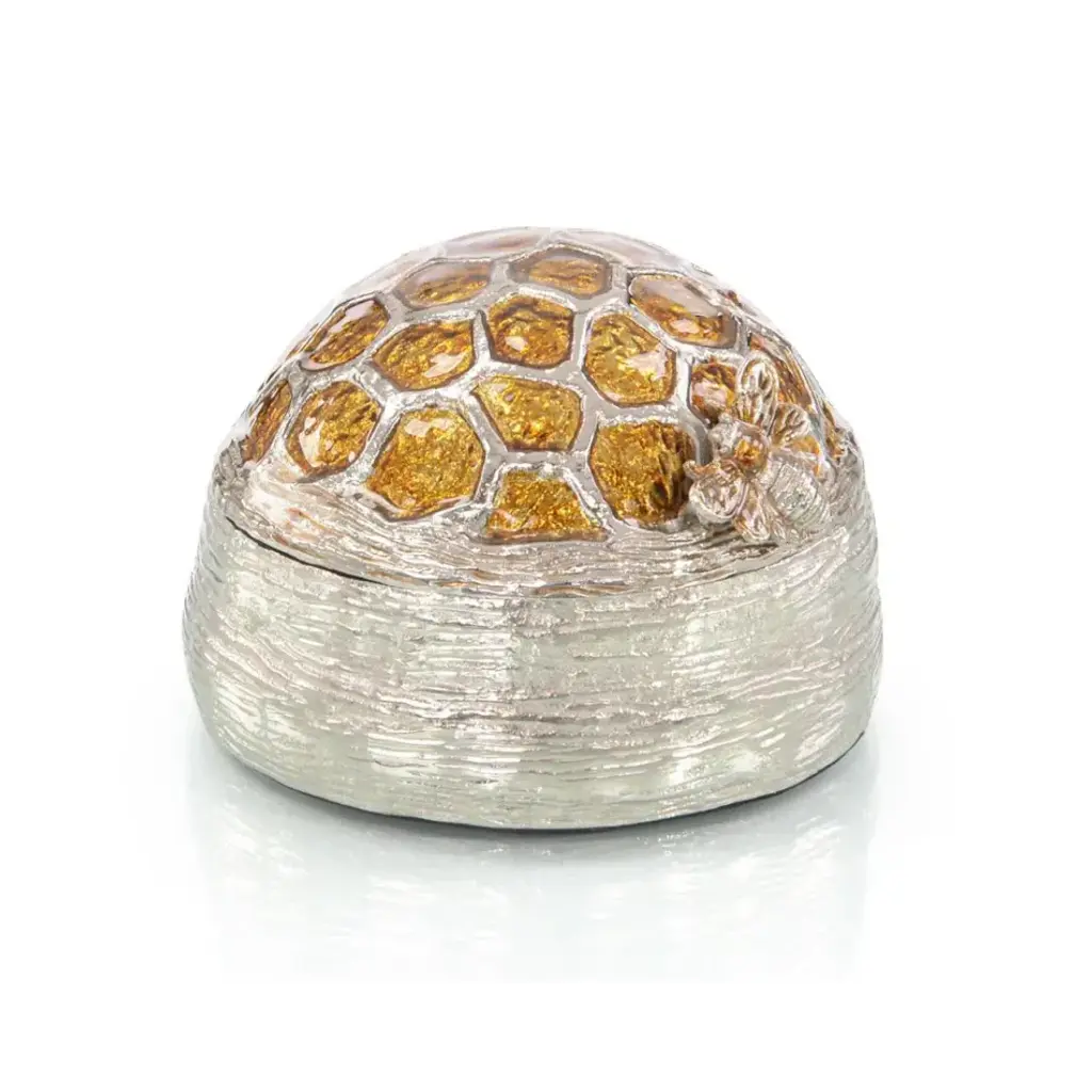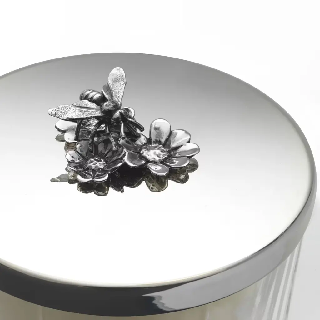 Charming and sophisticated, this exquisite candle vase will illuminate both a modern and classic decor with its delicate flair. Fashioned of glass, it allows for the warm flame of the candle (included) to reflect its light in every corner of the room, and when closed, it boasts a striking silver-plated lid with the sculptural decoration of a flower and a bee.