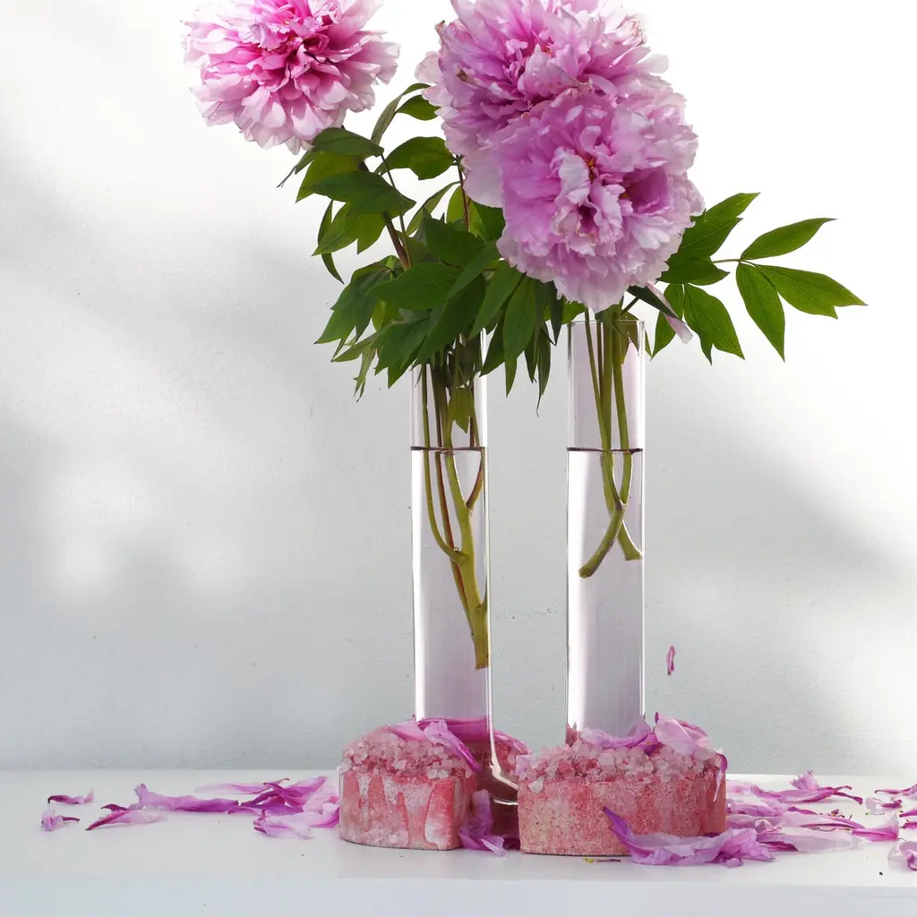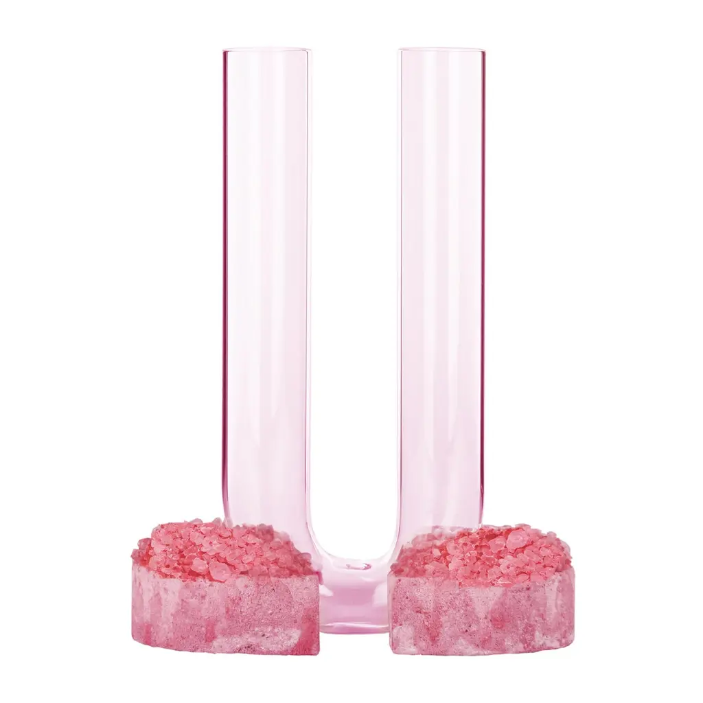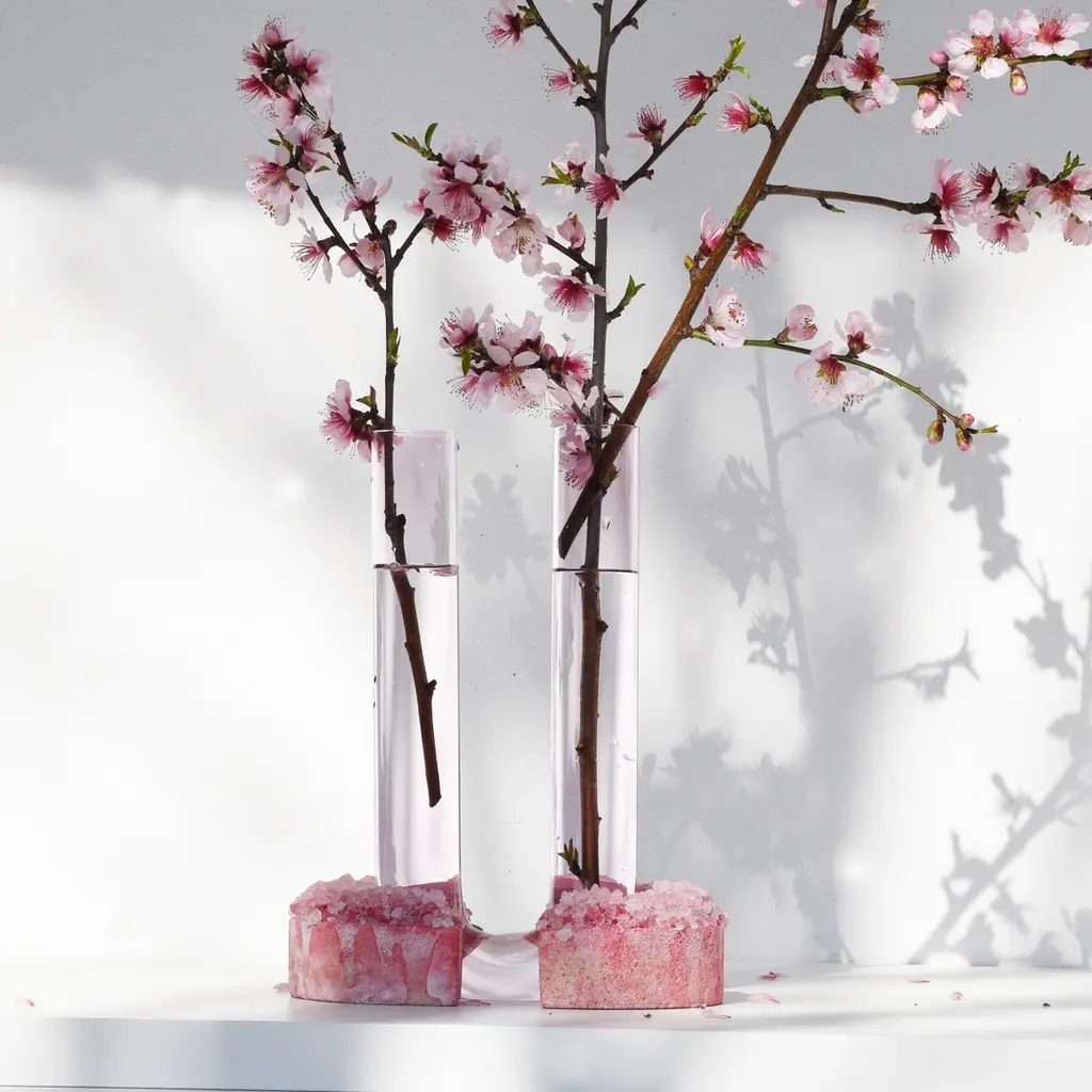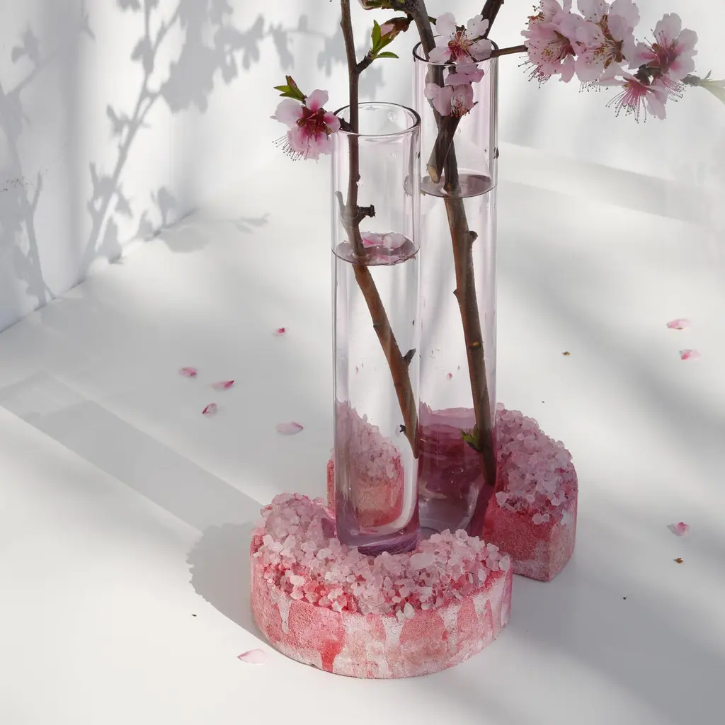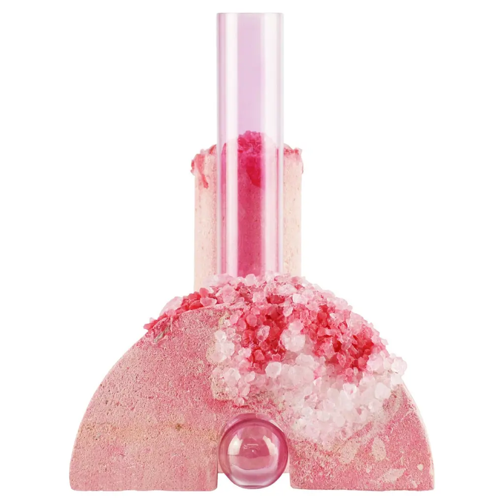 Spring Cochlea del Risveglio Seasons Edition vase by Coki BarbieriDimensions: W 24 x D 14 x H 30 cm.Materials: Handcrafted stone made with Matera stone fragments, sedimentary rocks of the Italian Apennines and pure water, Italian rock salt crystals, pink mineral pigments from Italian soils, pink painted borosilicate glass.Cochlea del Risveglio - SEASONS EDITION - SpringEmbellished with Italian rock salt crystals colored with natural pigments from the Italian subsoil, this vase from the Cochlea collection (inspired by the metamorphosis of snails) represents architecture and nature united together: curved and geometric shapes resulting from glass and sustainable stone.Like all COKI products, it is entirely made in Italy with raw materials processed according to the highest standards of recovery of virgin stones and using only substances that are not harmful to humans and the environment, without components of animal origin.The particular technique Glaciazione makes it possible to unite crystals and the handcrafted stone created from fragments of historical stones found in Matera (Città dei Sassi, UNESCO World Heritage, European Capital of Culture) and sedimentary rocks of the Italian Apennines, recovered and reprocessed following a sustainable production cycle. This material research is originalfrom the COKI studio and uses a natural chemical and physical adhesion process between the two materials. The result is a composite material, biodegradable in water, so it is recommended not to wet the stone part and always keep it away from sources of humidity.A precious objects collection made in Italy with natural and vegan origin materials, conceived by architectural and product designer Coki Barbieri and created by the local craftsmen to expand a new slow living awareness and surround oneself with a few objects, capable of staying alongside us over time.The climate emergency and increased future anxiety push our work to imagine alternative ways of living, producing, and consuming. For that Coki Barbieri uses notions of geology, chemistry, and design culture to create new products (and materials) from fragments and waste from natural products (such as stone and minerals).Coki Barbieri established her eponymous studio-workshop in Rimini in 2017, bringing to life a sustainable way of conceiving the product design for home. Nature inspires her environmentally conscious creations, which are imbued with emotional energy while maintaining their aesthetic impact and practical functionality. Coki collaborates with talented Italian craftsmen to produce one-of-a-kind homeware objects capable of unlocking new synergies between concepts, materials, and use.