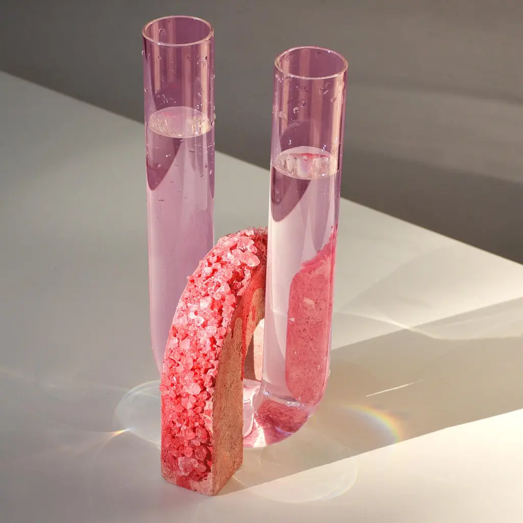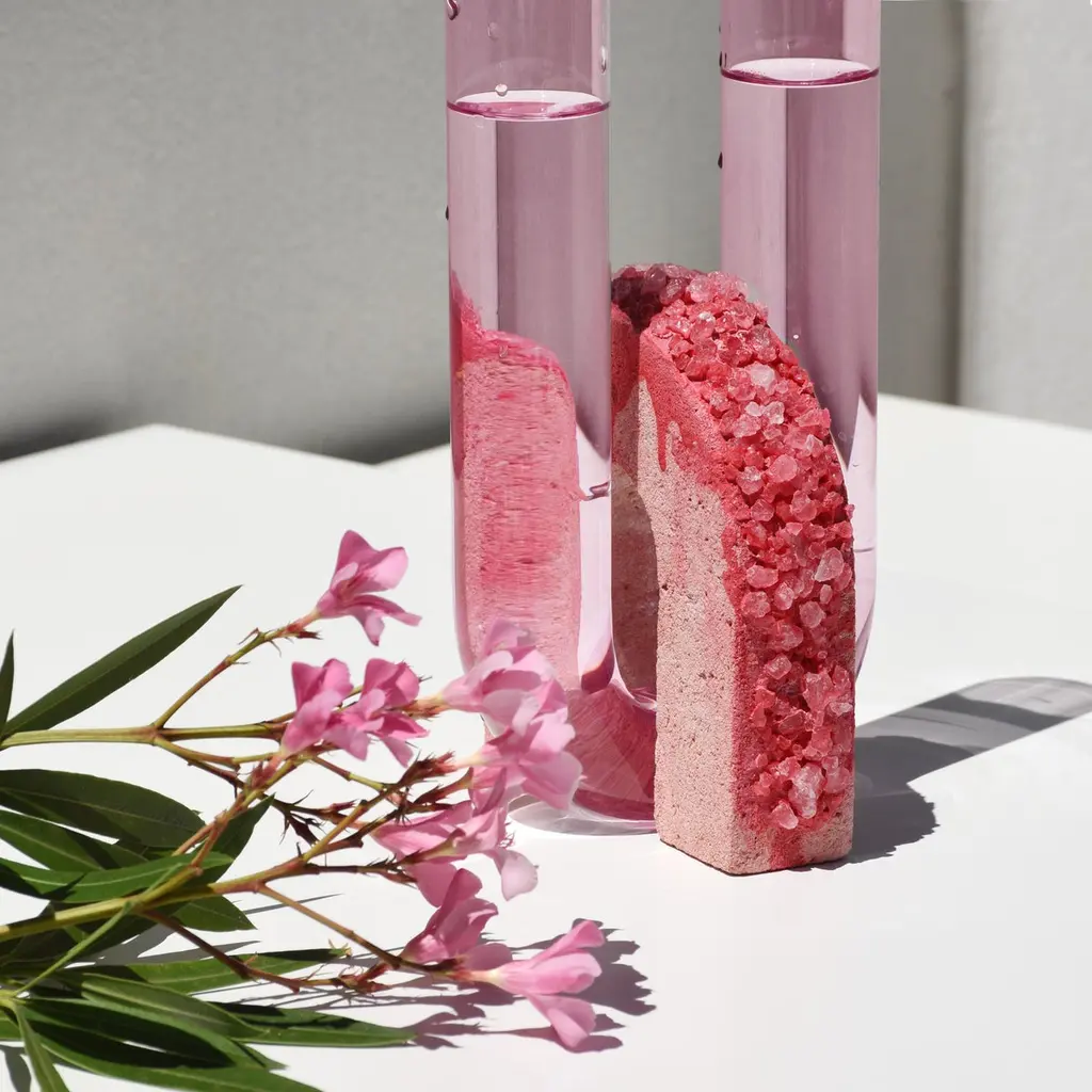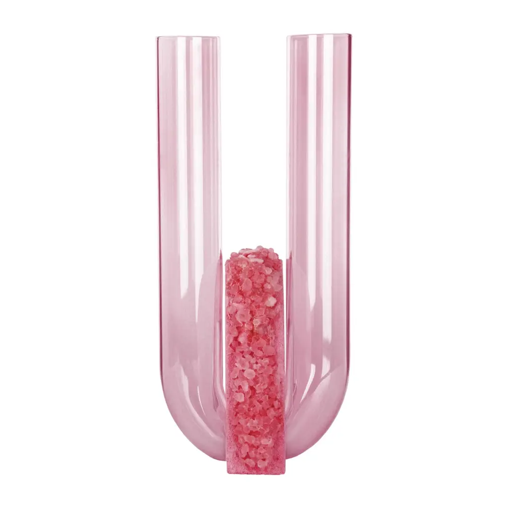 Spring Cochlea Della Liberazione Seasons edition vase by Coki BarbieriDimensions: W 14 x D 14 x H 30 cm.Materials: Handcrafted stone made with Matera stone fragments, sedimentary rocks of the Italian Apennines and pure water, Italian rock salt crystals, pink mineral pigments from Italian soils, pink painted borosilicate glassCochlea della Liberazione - SEASONS EDITION - SpringEmbellished with Italian rock salt crystals colored with natural pigments from the Italian subsoil, this vase from the Cochlea collection (inspired by the metamorphosis of snails) represents architecture and nature united together: curved and geometric shapes resulting from glass and sustainable stone.Like all COKI products, it is entirely made in Italy with raw materials processed according to the highest standards of recovery of virgin stones and using only substances that are not harmful to humans and the environment, without components of animal origin.The particular technique Glaciazione makes it possible to unite crystals and the handcrafted stone created from fragments of historical stones found in Matera (Città dei Sassi, UNESCO World Heritage, European Capital of Culture) and sedimentary rocks of the Italian Apennines, recovered and reprocessed following a sustainable production cycle. This material research is originalfrom the COKI studio and uses a natural chemical and physical adhesion process between the two materials. The result is a composite material, biodegradable in water, so it is recommended not to wet the stone part and always keep it away from sources of humidity.A precious objects collection made in Italy with natural and vegan origin materials, conceived by architectural and product designer Coki Barbieri and created by the local craftsmen to expand a new slow living awareness and surround oneself with a few objects, capable of staying alongside us over time.The climate emergency and increased future anxiety push our work to imagine alternative ways of living, producing, and consuming. For that Coki Barbieri uses notions of geology, chemistry, and design culture to create new products (and materials) from fragments and waste from natural products (such as stone and minerals).Coki Barbieri established her eponymous studio-workshop in Rimini in 2017, bringing to life a sustainable way of conceiving the product design for home. Nature inspires her environmentally conscious creations, which are imbued with emotional energy while maintaining their aesthetic impact and practical functionality. Coki collaborates with talented Italian craftsmen to produce one-of-a-kind homeware objects capable of unlocking new synergies between concepts, materials, and use.